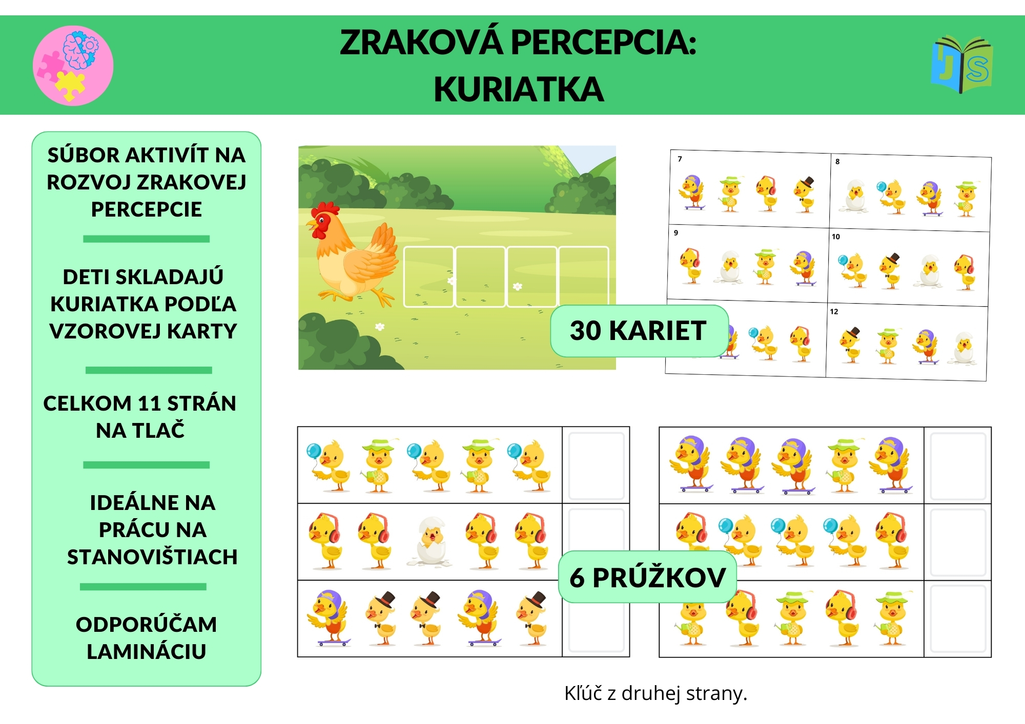 Súčasťou materiálu je aj 6 sekvenčných prúžkov, kde deti dopĺňajú chýbajúce kuriatko a pokračujú v logickom vzore. Kontrolný kľúč je umiestnený z druhej strany, čo umožňuje samostatnú kontrolu.