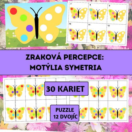 Zraková percepcia – Motýlia symetria je vzdelávací materiál zameraný na rozvoj zrakového vnímania, vizuálnej pamäti, priestorovej orientácie a pochopenia princípu osovej súmernosti. Aktivita prebieha v dvoch krokoch – deti najprv zostavia ľavú časť motýľa podľa vzorovej karty a následne pravú časť doplnia zrkadlovo, teda symetricky.