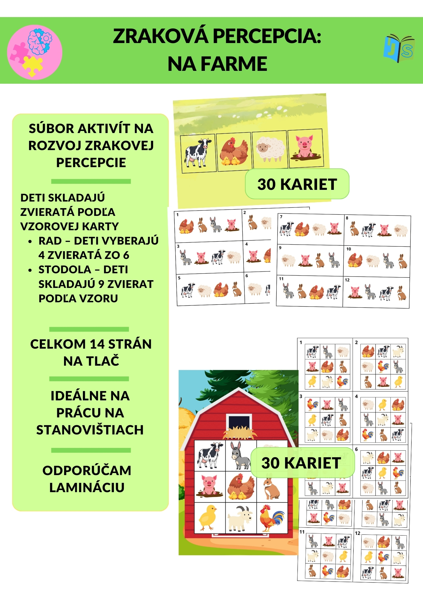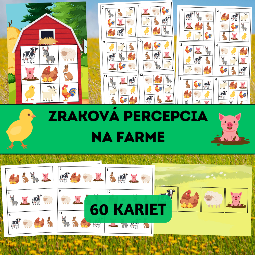 Zraková percepcia – Na farme je hravý vzdelávací materiál zameraný na rozvoj zrakového vnímania, pozornosti, pamäti a jemnej motoriky. Deti skladajú obrázky zvierat podľa vzorových kariet a učia sa porovnávať detaily, orientovať sa v priestore a presne kopírovať predlohu.