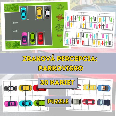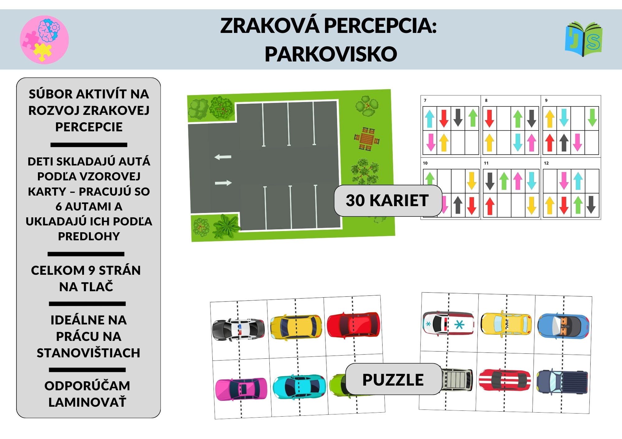 Súbor Zraková percepcia: Parkovisko je zameraný na rozvoj zrakového vnímania, koncentrácie pozornosti a priestorovej orientácie hravou a motivujúcou formou.