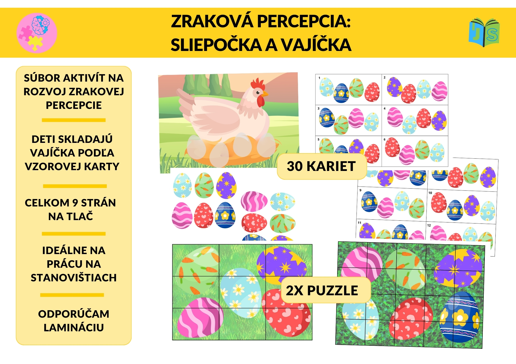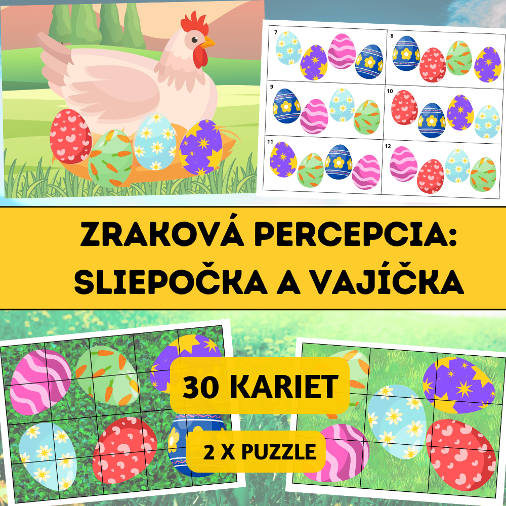 Zraková percepcia – Sliepočka a vajíčka je hravý vzdelávací materiál zameraný na rozvoj zrakového vnímania, pozornosti k detailu, vizuálnej pamäti a priestorovej orientácie. Vďaka jarnému motívu je aktivita pre deti prirodzene motivujúca a atraktívna.