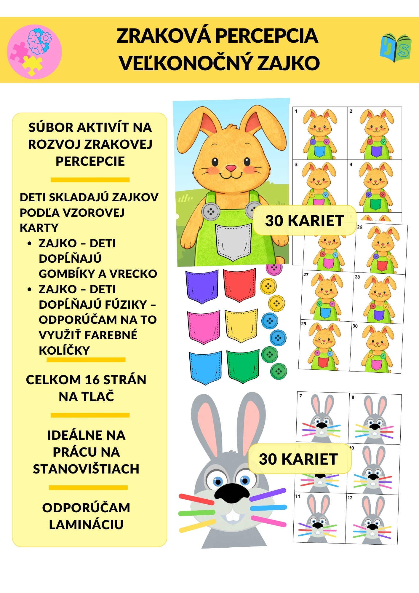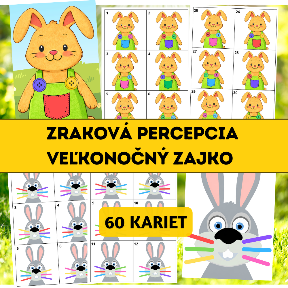 Zraková percepcia – Veľkonočný zajko je zábavný a praktický vzdelávací materiál zameraný na rozvoj zrakového vnímania, pozornosti, sústredenia a jemnej motoriky. Vďaka motívu roztomilých veľkonočných zajkov deti pracujú s chuťou a hravou formou.