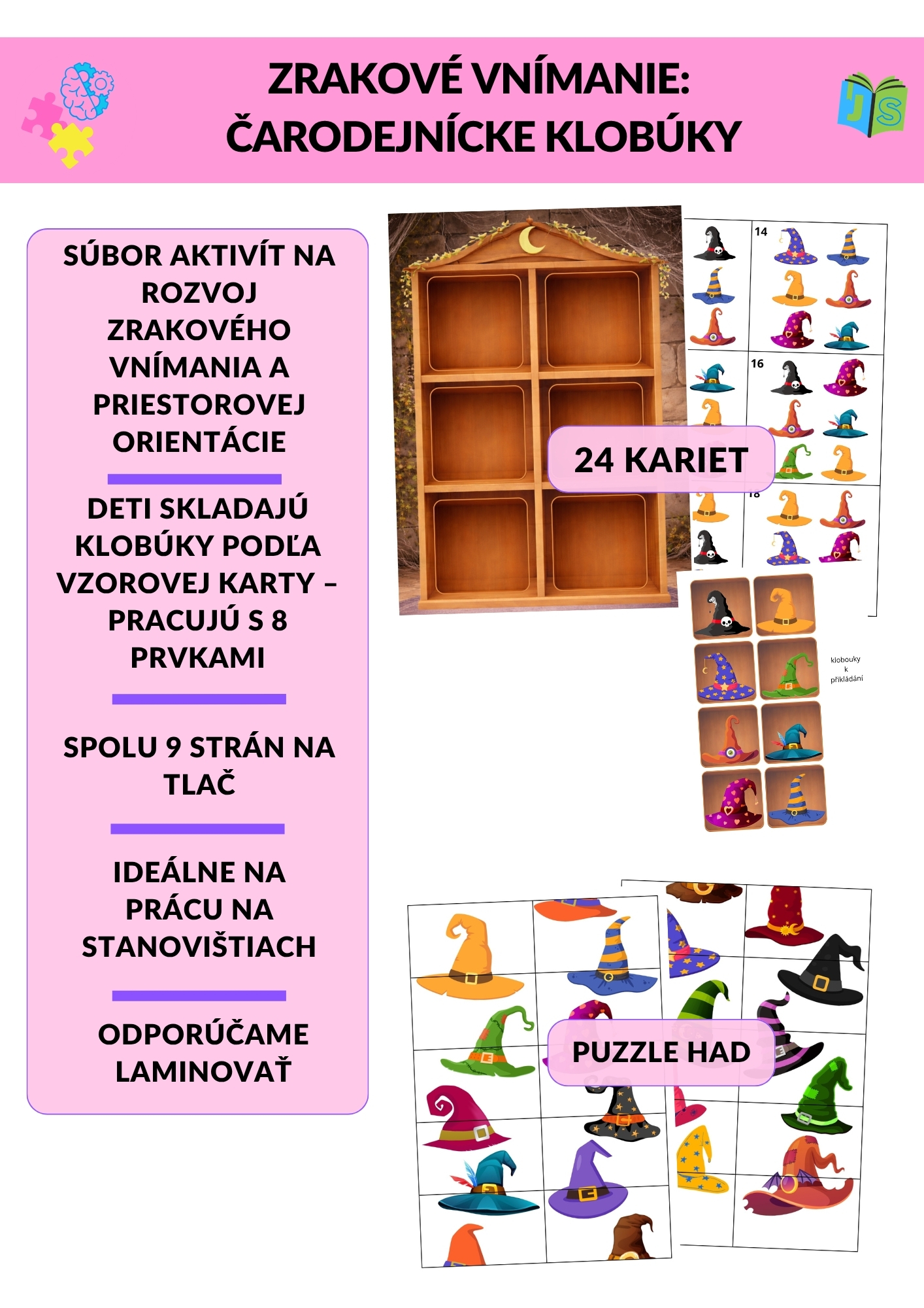 Zrakové vnímanie: Čarodejnícke klobúky je hravá vzdelávacia aktivita zameraná na rozvoj zrakového vnímania, vizuálnej diferenciácie, priestorovej orientácie a logického myslenia.