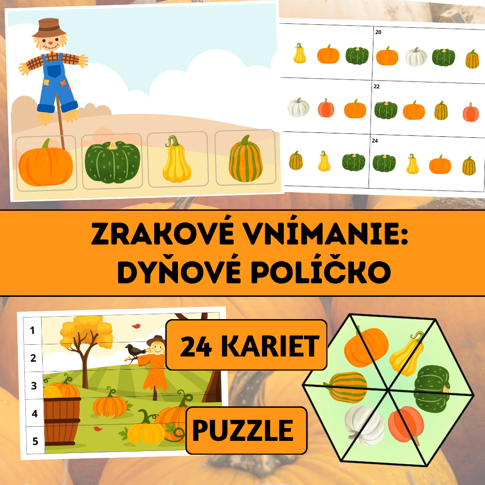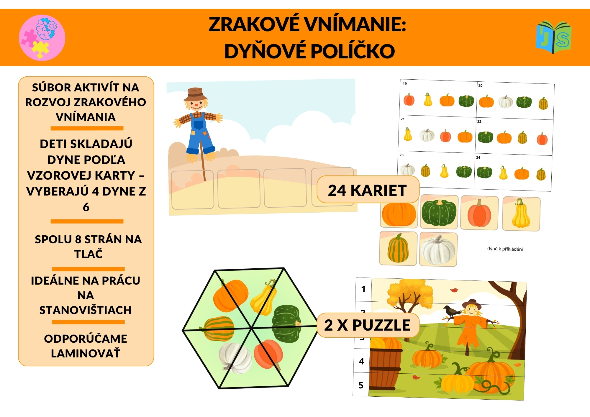 Súbor Zrakové vnímanie: Dyňové políčko je zameraný na rozvoj zrakového vnímania, koncentrácie pozornosti, vizuálnej pamäti a priestorovej orientácie.