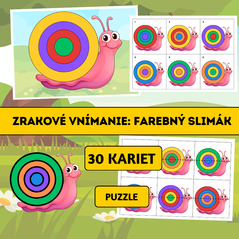 Zrakové vnímanie: Farebný slimák je tematický vzdelávací materiál zameraný na rozvoj zrakového vnímania, vizuálnej diferenciácie, pamäti a logického myslenia. Aktivita podporuje sústredenie, priestorovú orientáciu aj jemnú motoriku.