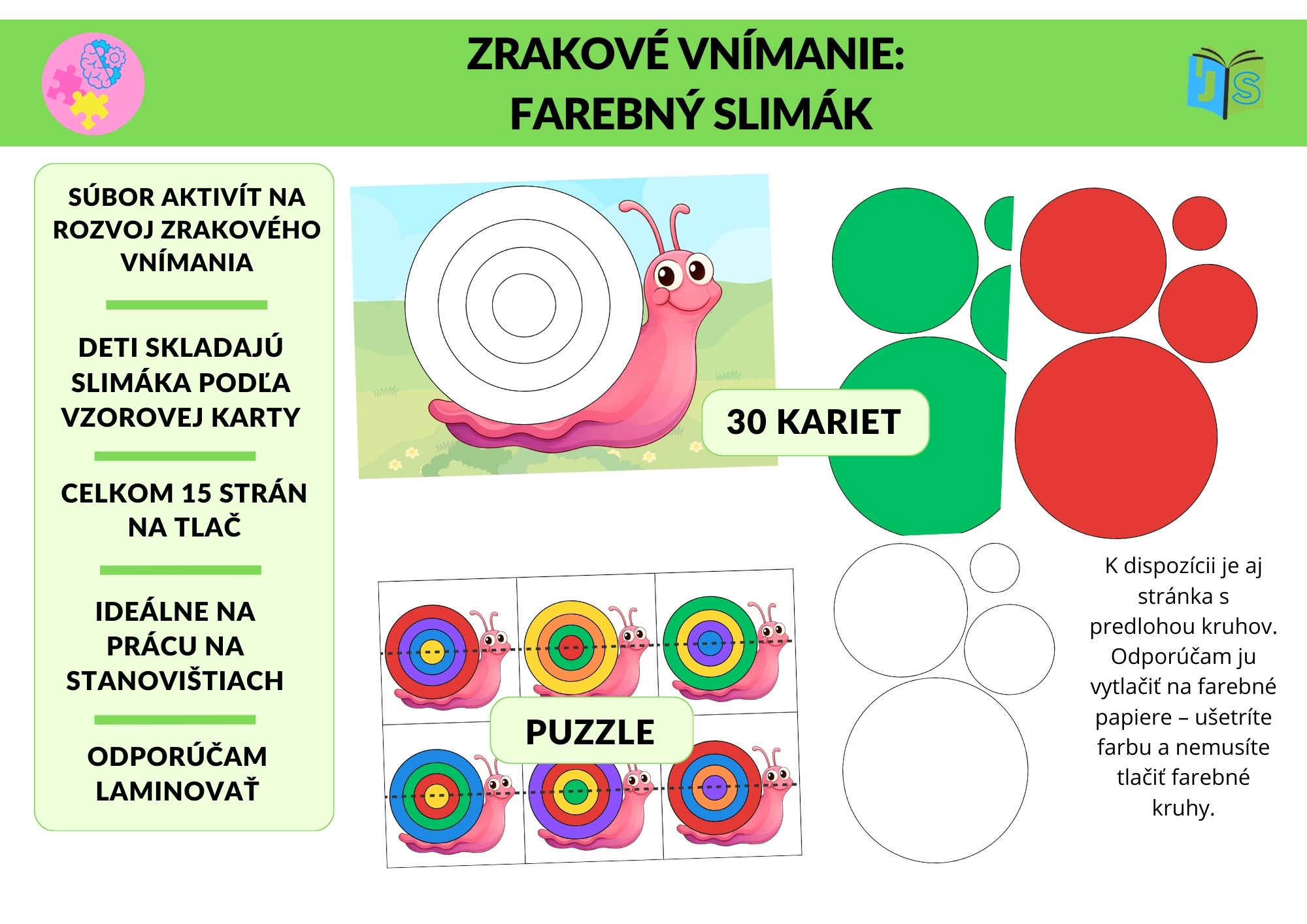Deti skladajú farebnú ulitu slimáka podľa 30 vzorových kariet. Z ponuky kruhov vyberajú správne 4 farby a zoradia ich presne podľa predlohy. Súčasťou súboru je podkladová karta s vyznačenými obrysmi dielikov, ktorá slúži ako vizuálna opora a podporuje predstavivosť detí pri pochopení princípu skladania.