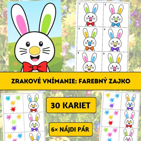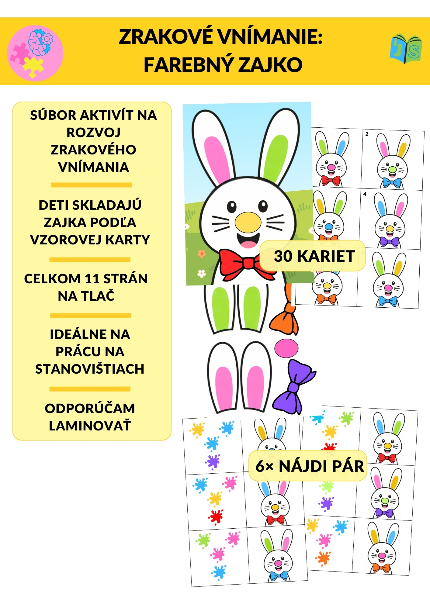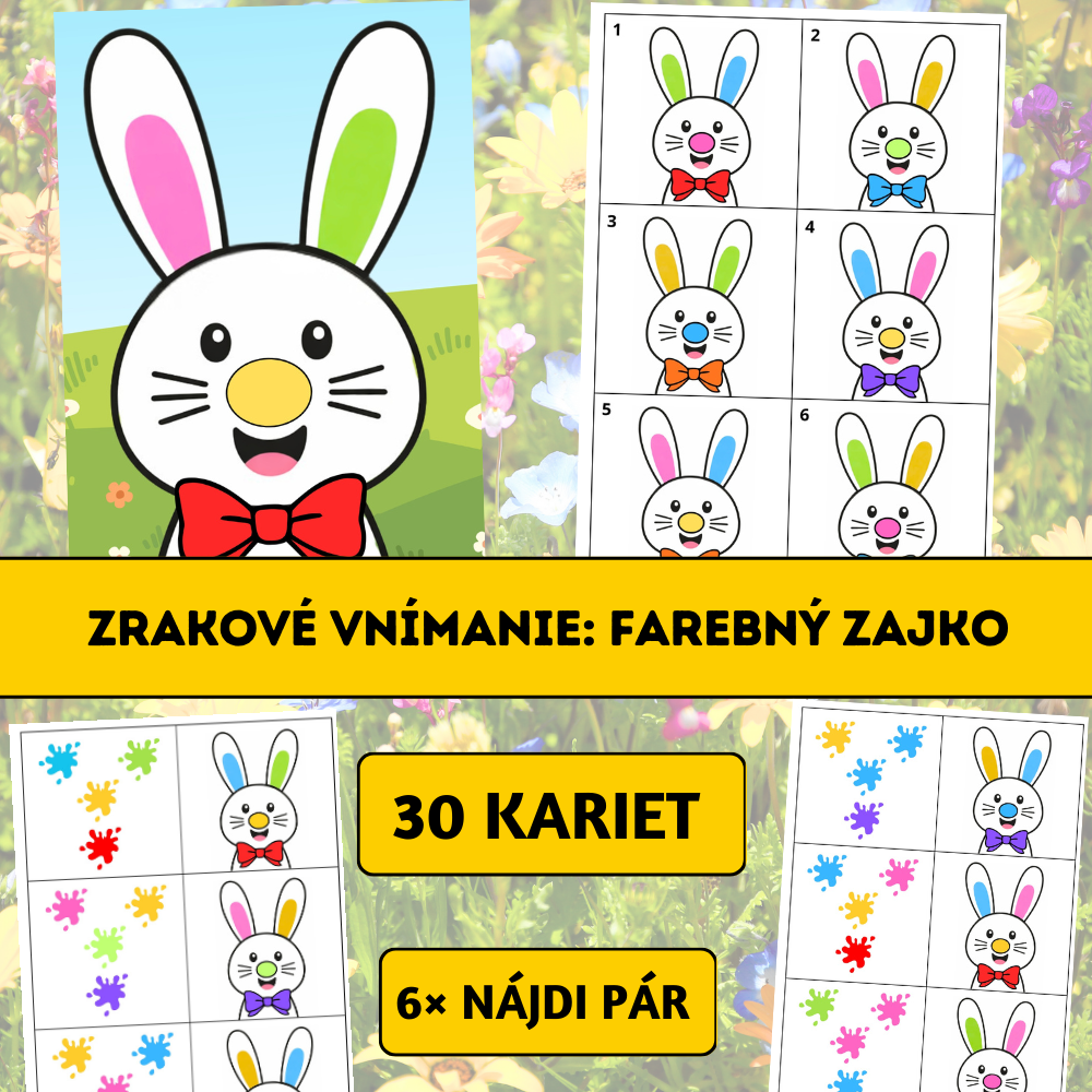 Súbor Zrakové vnímanie: Farebný zajko je hravá aktivita zameraná na rozvoj zrakového vnímania, vizuálnej pamäti a koncentrácie pozornosti.