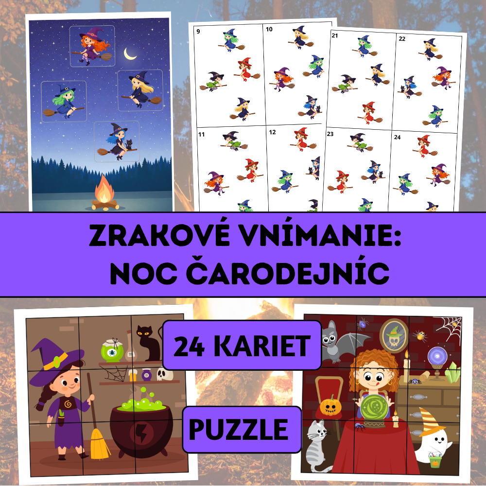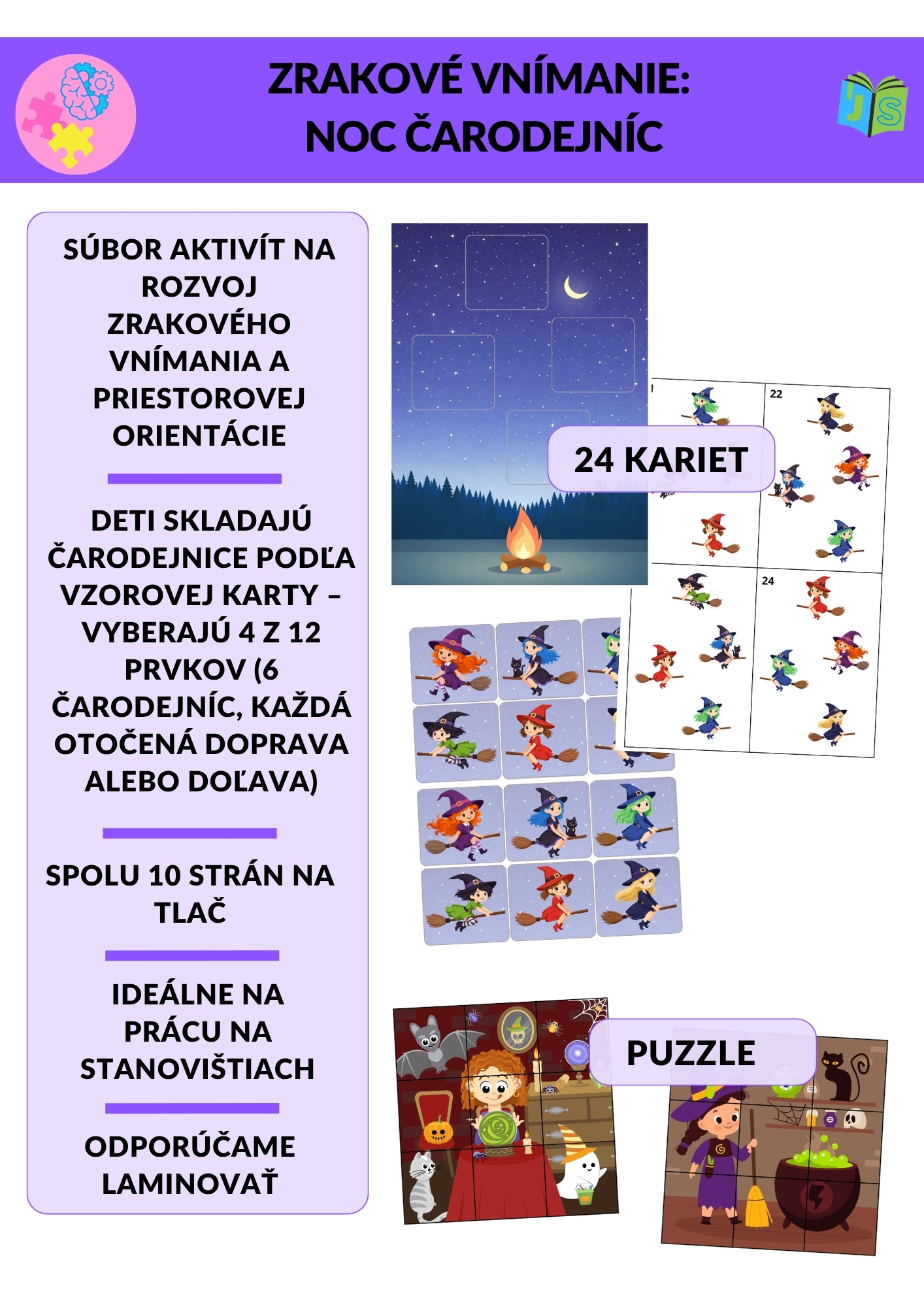 Súbor Zrakové vnímanie: Noc čarodejníc je hravá vzdelávacia aktivita zameraná na rozvoj zrakového vnímania, vizuálnej diferenciácie, priestorovej orientácie a logického myslenia.