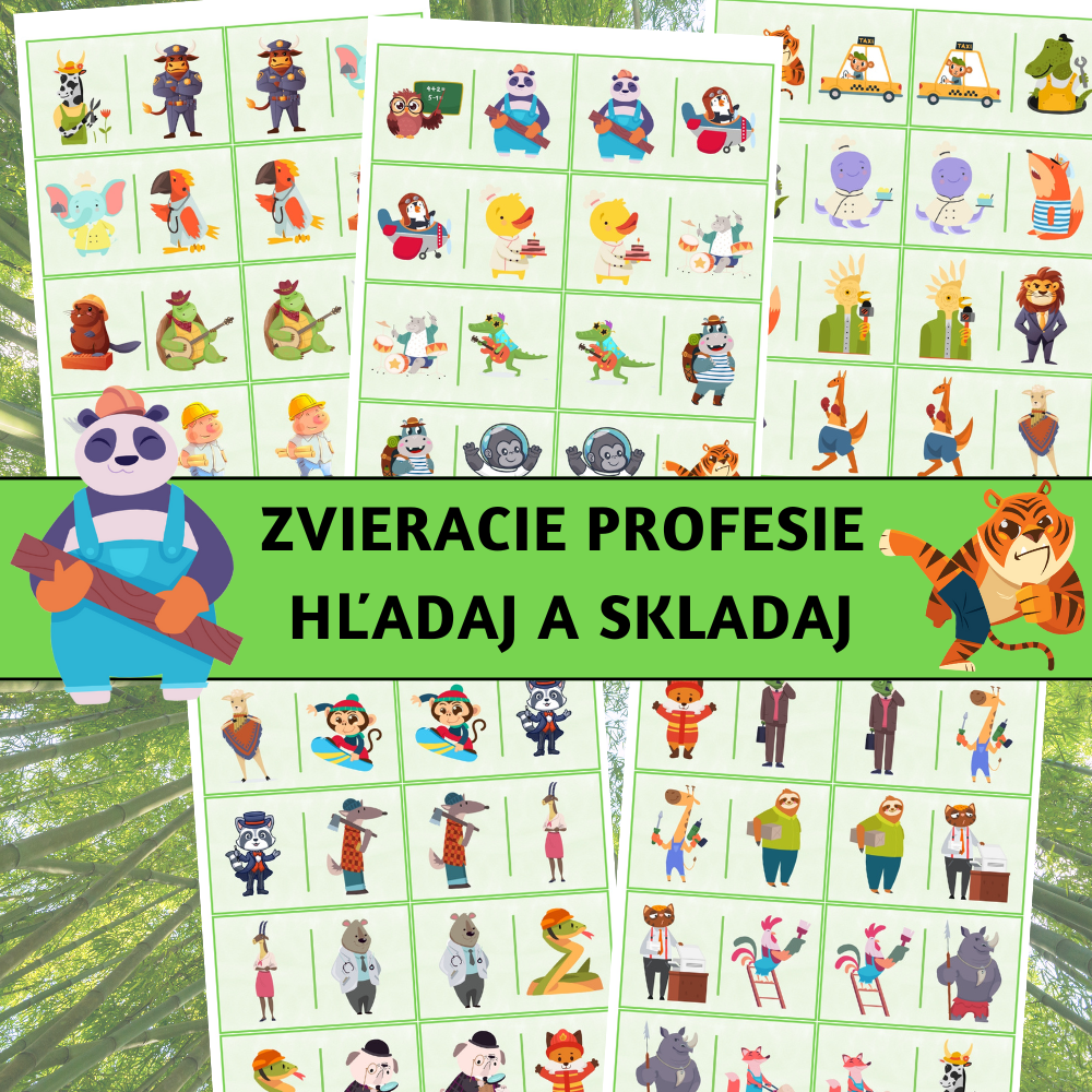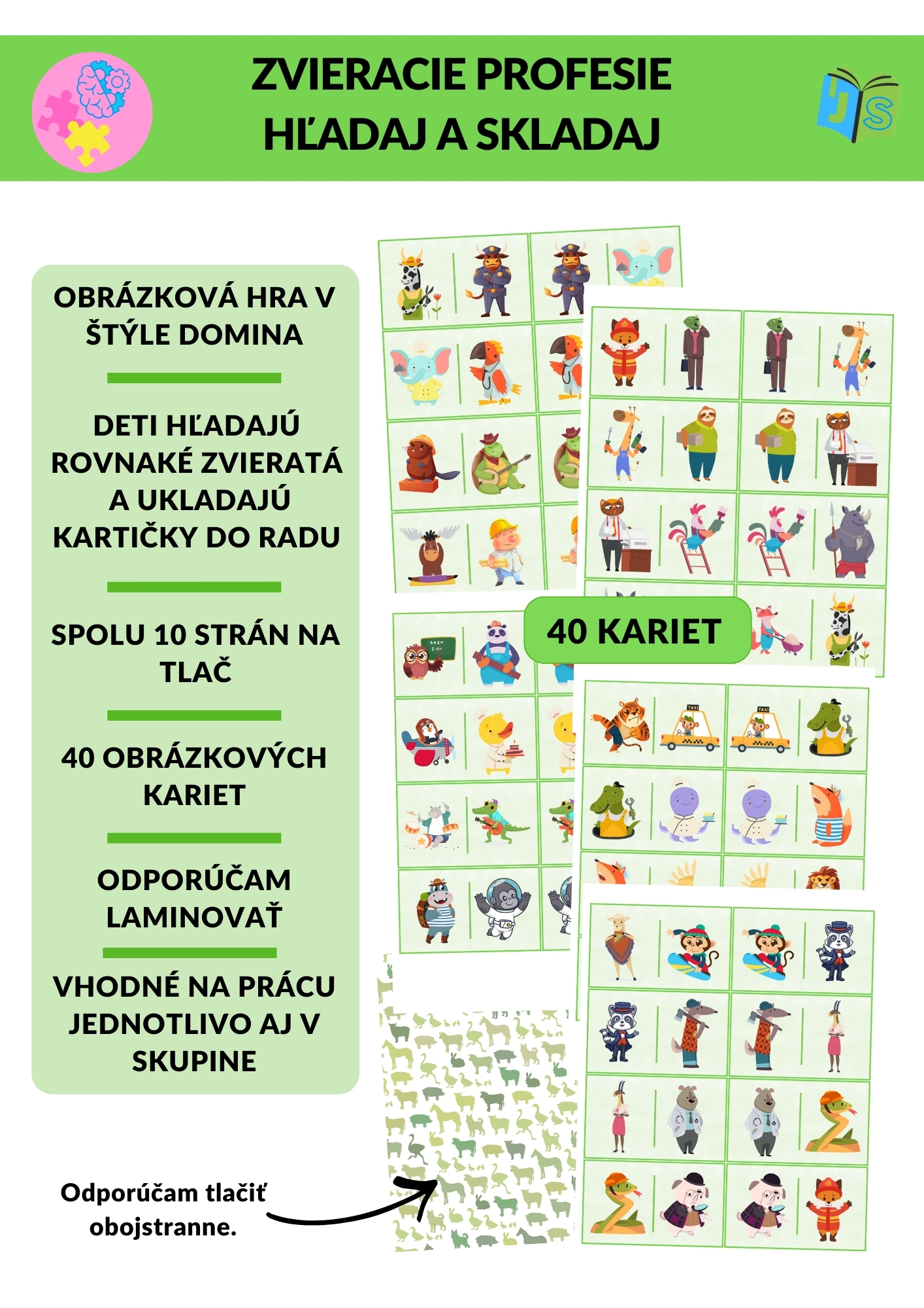 Táto obrázková aktivita v štýle domina je zameraná na rozvoj zrakovej percepcie, pozornosti, vizuálnej pamäti a schopnosti porovnávania. Deti hľadajú zhodné obrázky zvieratiek v rôznych povolaniach a ukladajú kartičky za sebou tak, aby vznikol tzv. „domino had“. Materiál je vhodný na prácu v triede, na stanovištiach, v centrách aktivít aj pri individuálnej činnosti. Odporúčame laminovať pre opakované využitie.