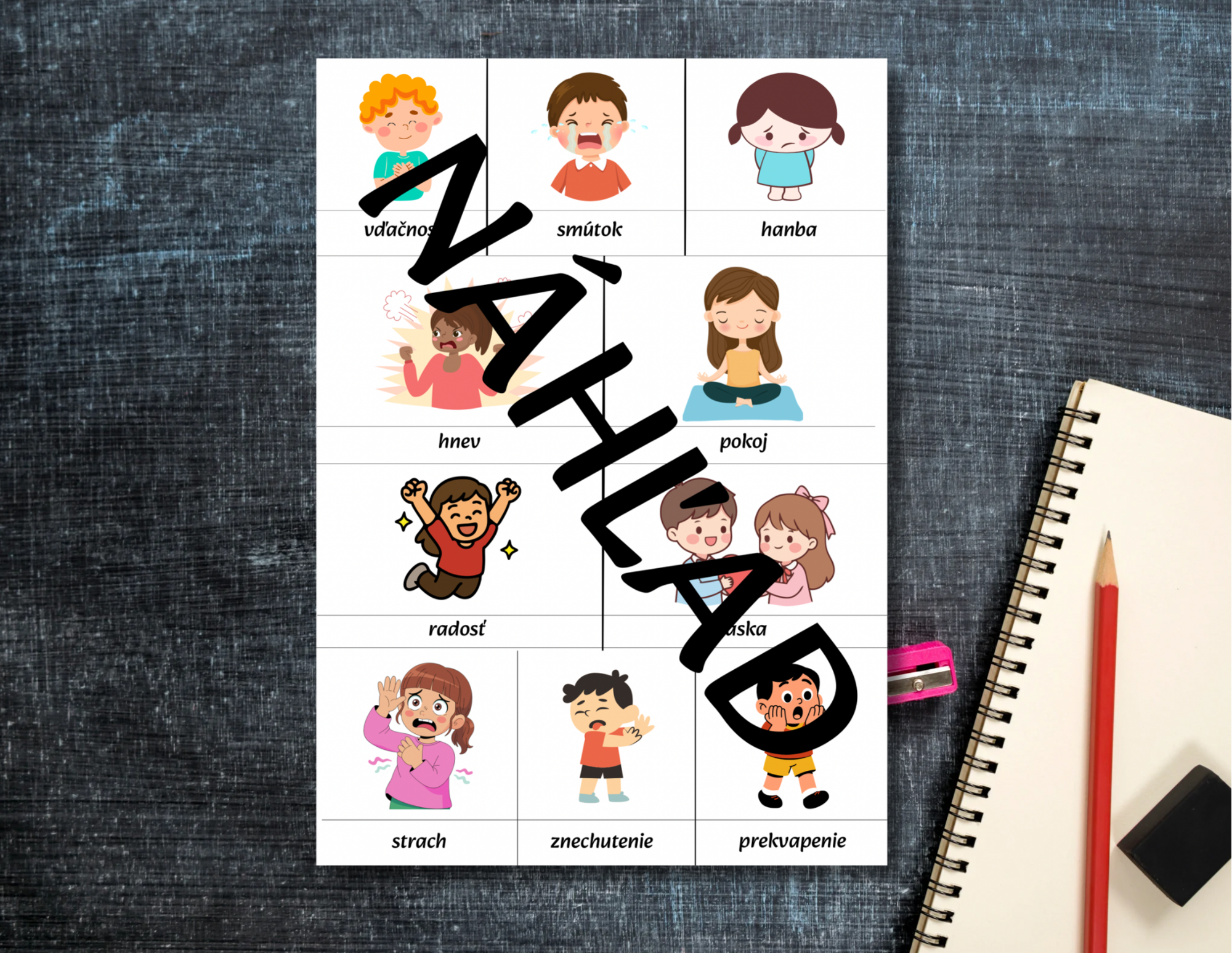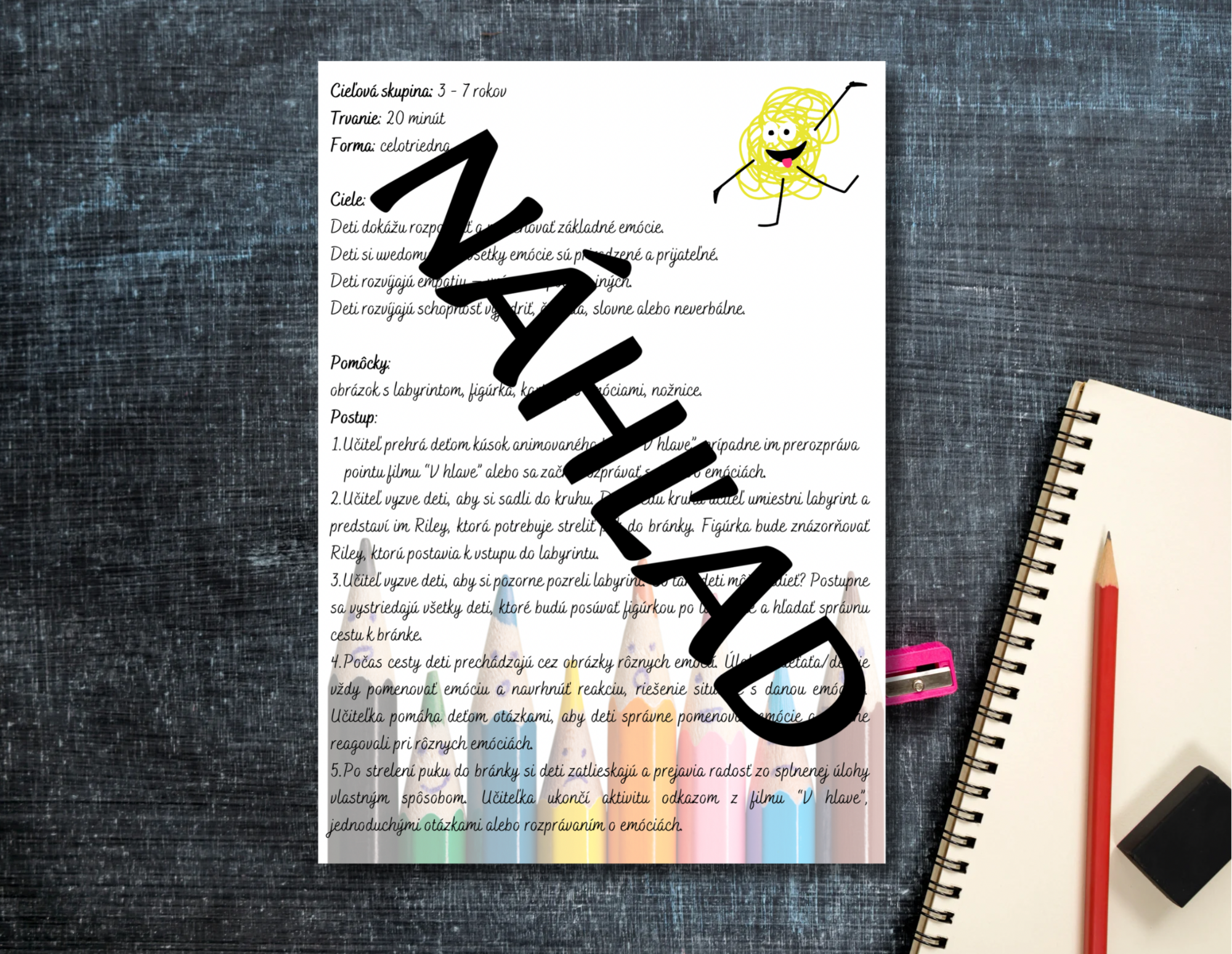 Materiál obsahuje metodiku ku aktivite pre učiteľa, obrázok labyrintu s emóciami, obrázok labyrintu, kartičky s emóciami a ich názvami.
