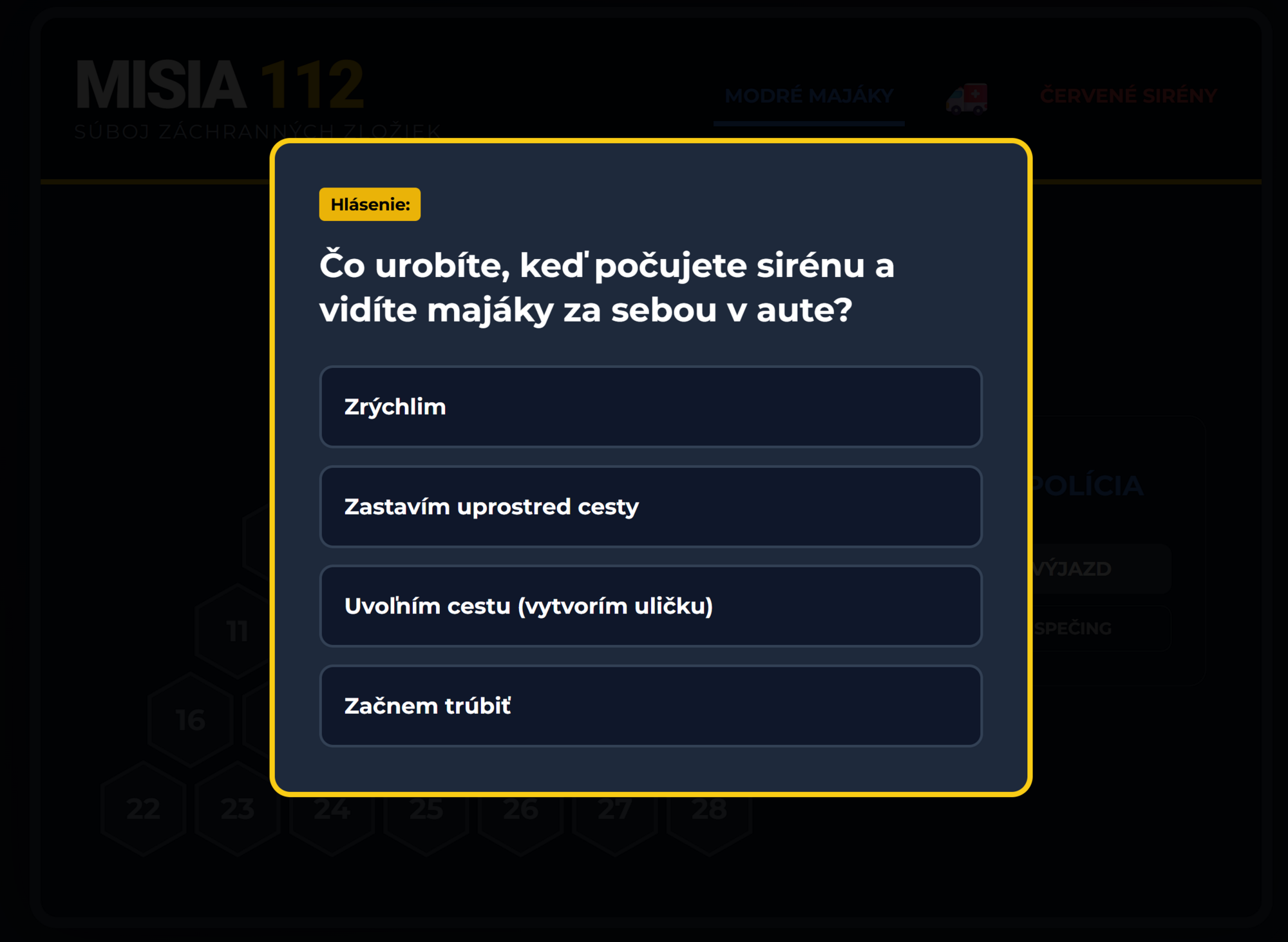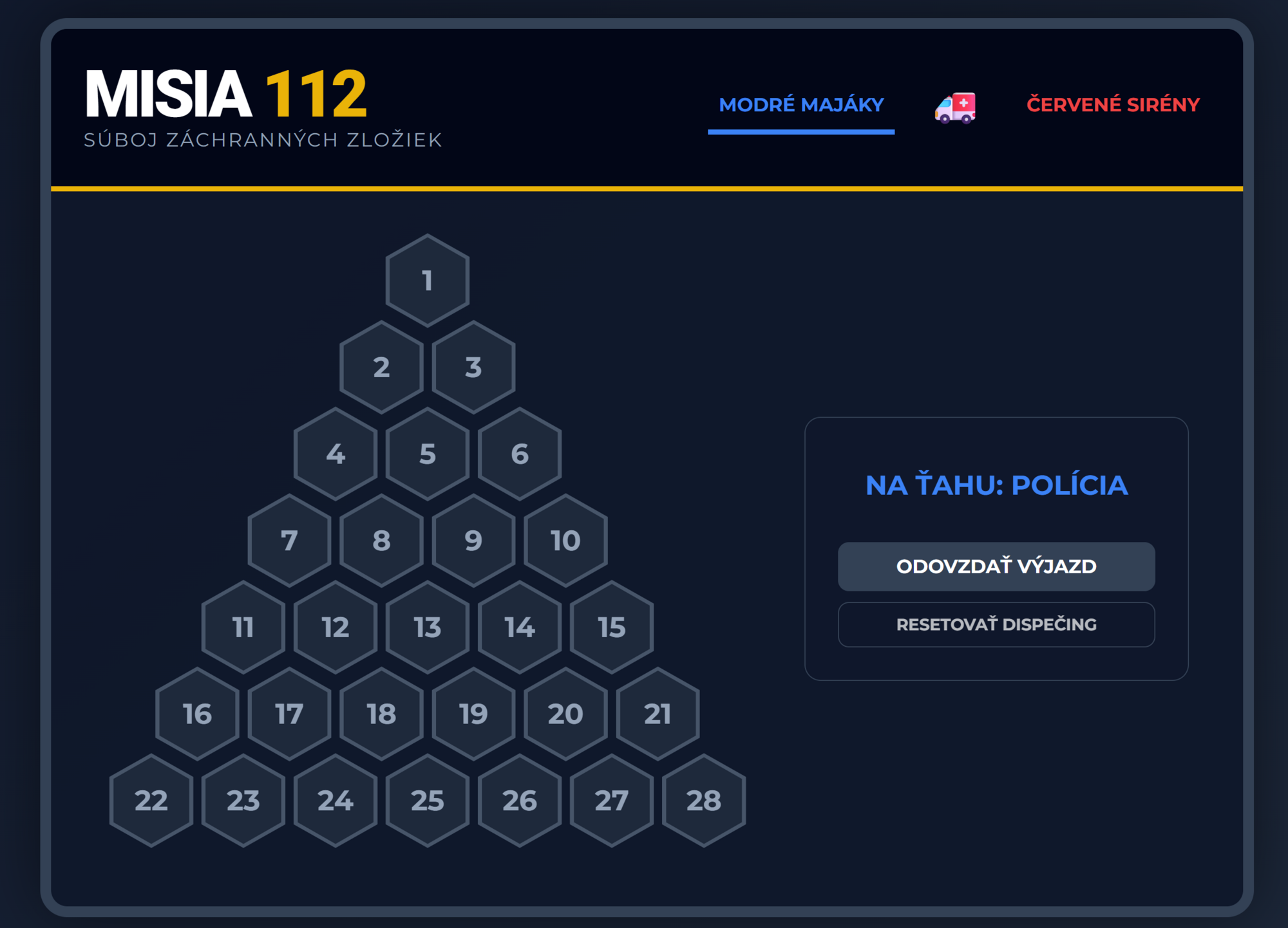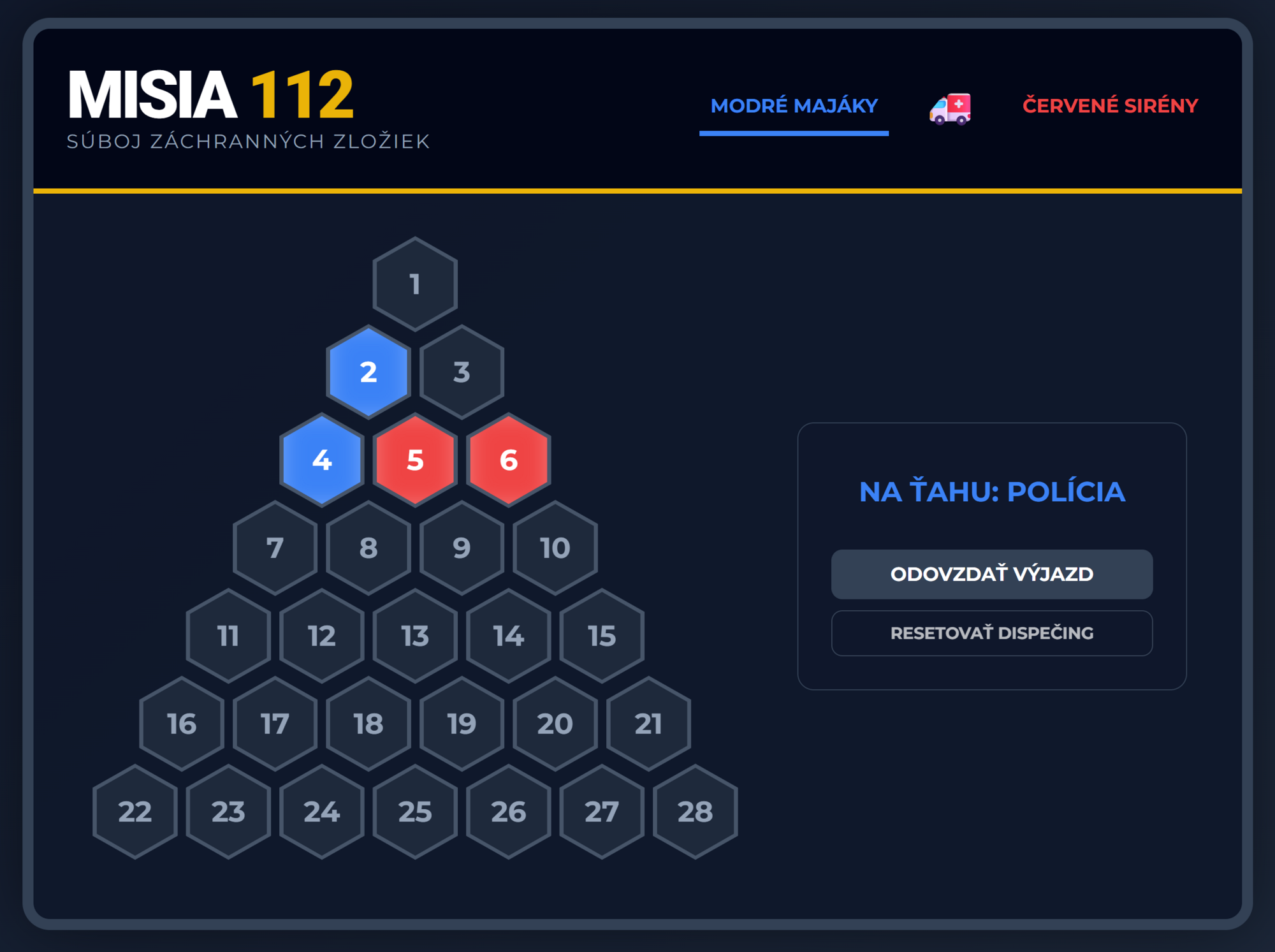 - Kompletná herná logika: Automatické striedanie dvoch tímov (Polícia vs. Hasiči), farebné obsadzovanie polí, neutralizácia polí pri zlej odpovedi a zvukové efekty majákov.
