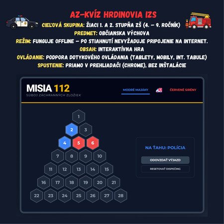 Premeňte hodinu na napínavý súboj medzi Modrými majákmi a Červenými sirénami! Táto digitálna hra prenáša obľúbený formát televíznej súťaže AZ-kvíz priamo do vašej triedy. Žiaci sa hravou formou ponoria do sveta záchranárov, policajtov a hasičov.