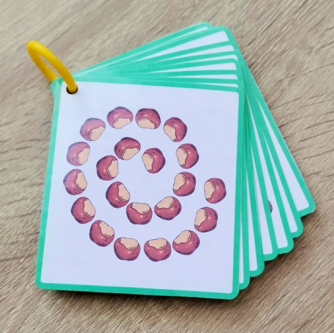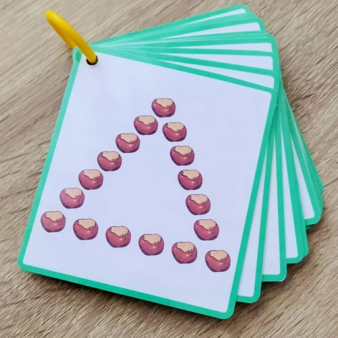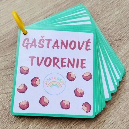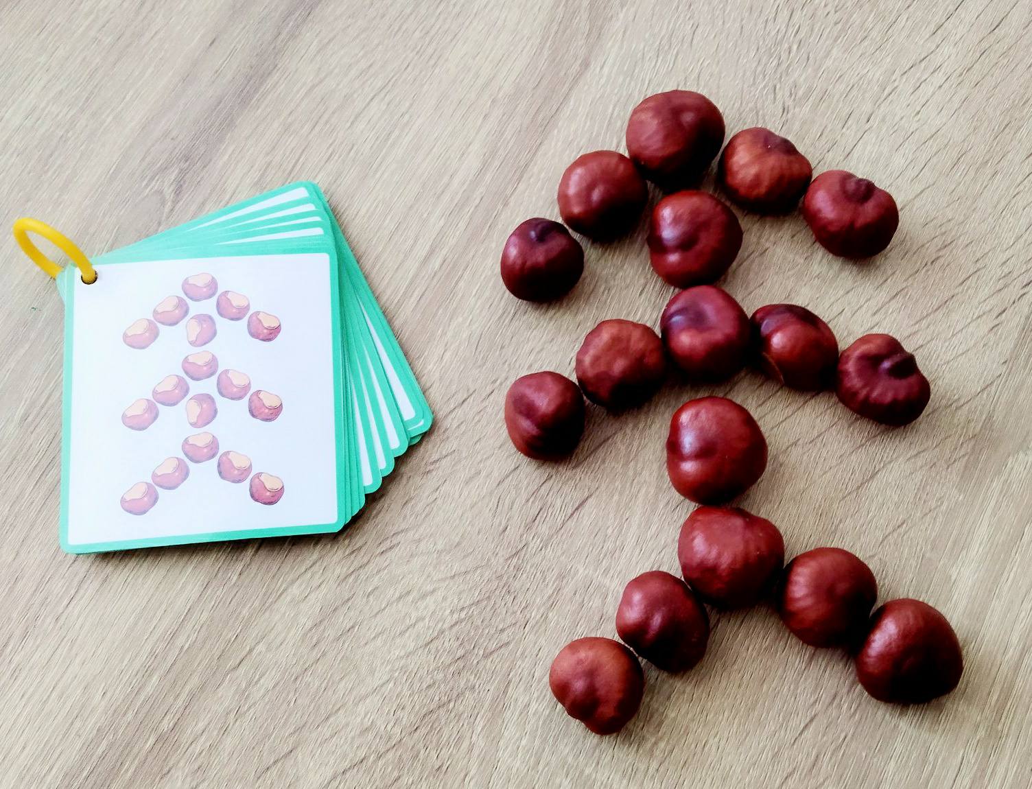 Úlohou dieťaťa je vytvoriť obrázok z gaštanov podľa predlohy na kartičke.