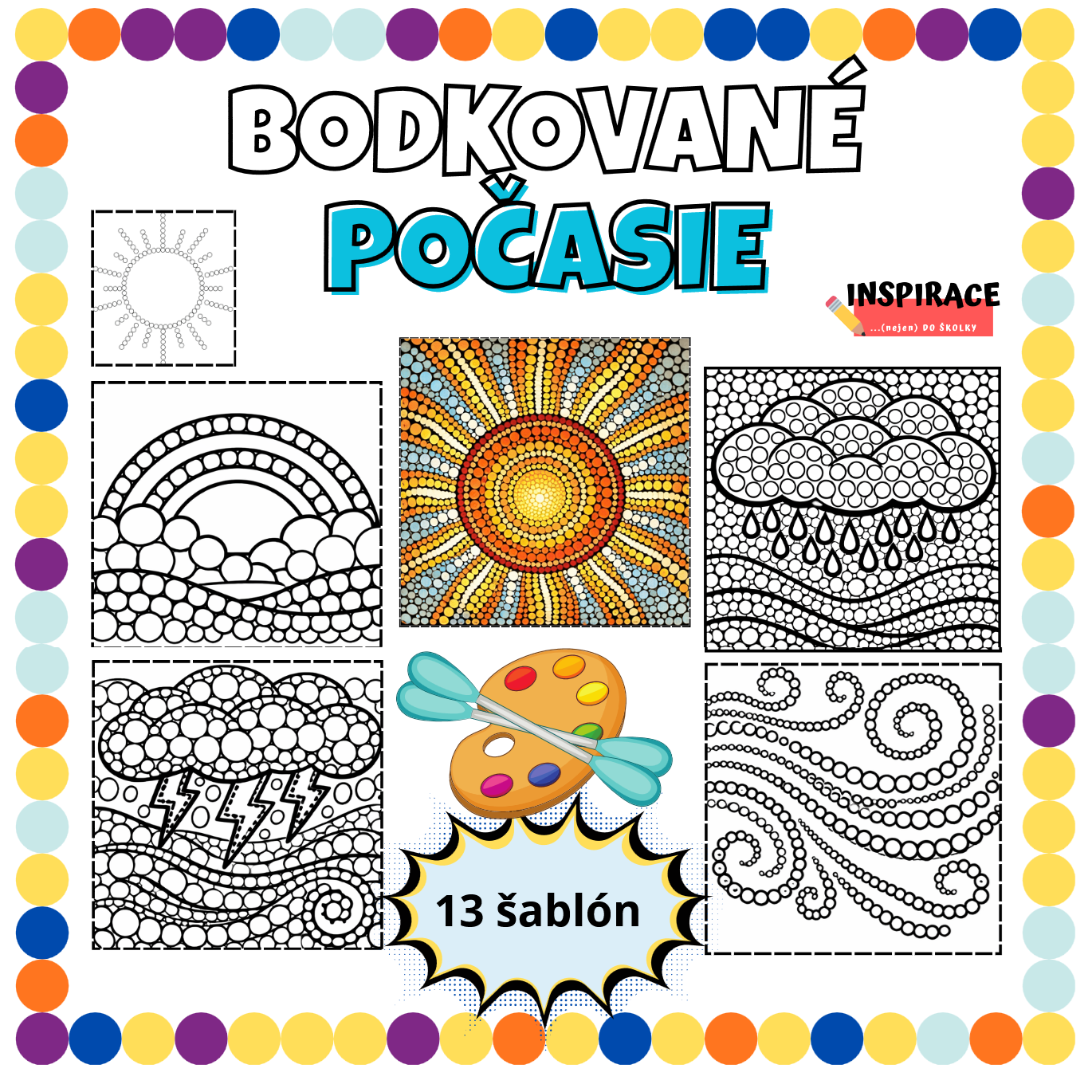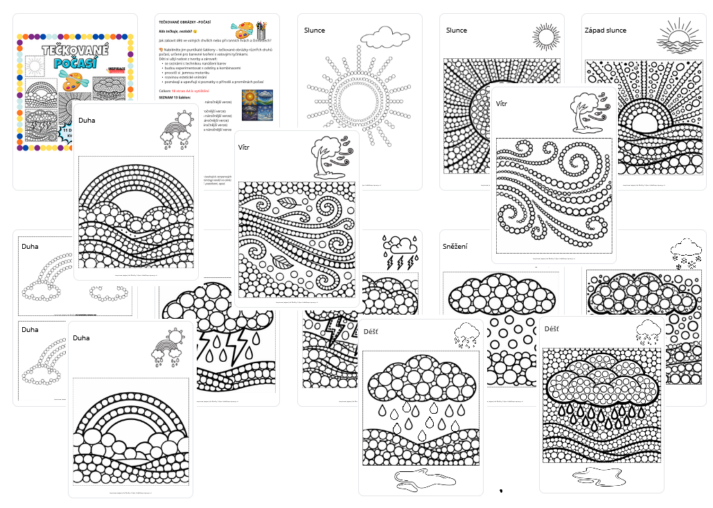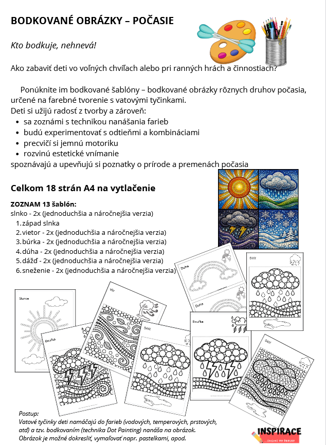 🎨 Ponúknite im bodkované šablóny – bodkované obrázky rôznych druhov počasia, určené na farebné tvorenie s vatovými tyčinkami.