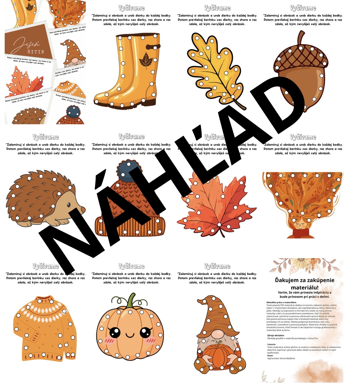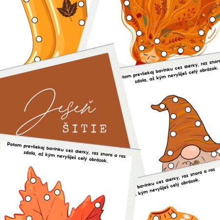 Tento jesenný PDF materiál je ideálny na tvorivé a zábavné aktivity s deťmi. Súbor s 10 jesennými obrázkami, ako napríklad tekvica, čižmy, žaluď, list a ježko. Obrázky sú pripravené vo formáte A4 a slúžia na rozvoj jemnej motoriky u detí a to prostredníctvom prevliekania. Stačí ich vytlačiť, zalaminovať, vystrihnúť a pomocou dierkovača vytvoriť dierky po obvode. Deti potom pomocou tupých ihiel a farebných bavlniek alebo vlny prevliekajú niť cez dierky. Aktivita podporuje koordináciu oko–ruka, trpezlivosť, sústredenie a presnosť pohybov. Materiál je vhodný na jesenné tematické tvorenie, tiché činnosti či ako doplnok k rozvoju grafomotoriky v materskej škole aj doma.