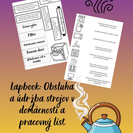 Materiál tvorí: Lapbook (Umývačka riadu), Lapbook (práčka) a pracovný list ( Spájačka: Obsluha a údržba strojov v domácnosti). Hlavnou úlohou v pracovnom liste je spojiť spotrebič s činnosťou. Materiál môžete použiť na hodinách techniky na 2. st. ZŠ.