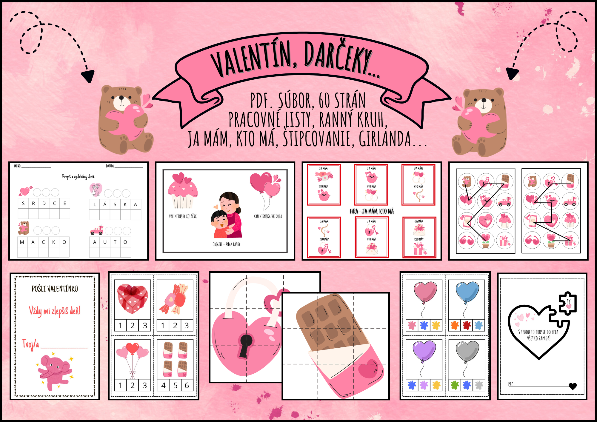 Milé pani učitel'ky, vychovávateľky, rodičia. Pripravila som si pre vás 60 strán pracovných listov na tému „Valentín, darčeky a valentínky.” V tomto PDF. súbore nájdete: