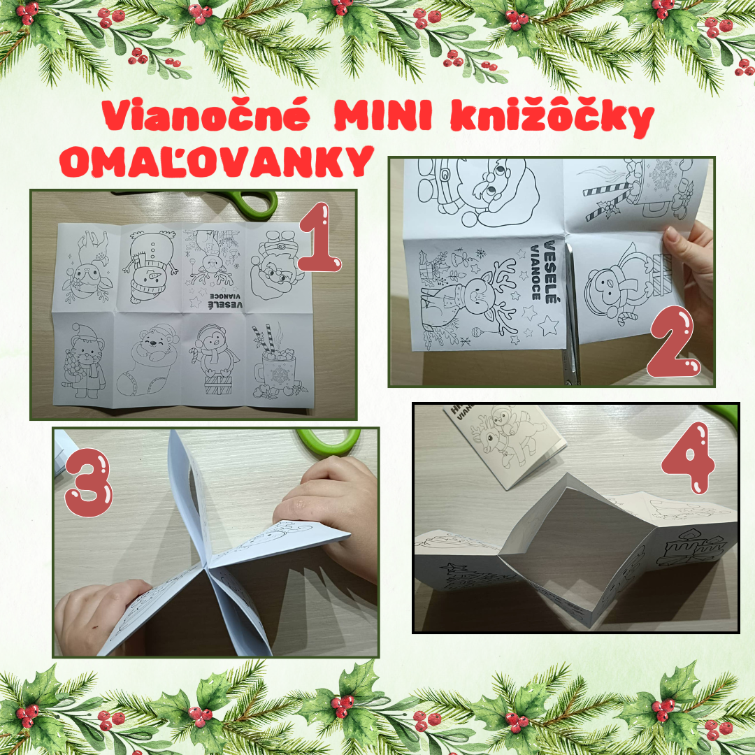 Knižôčka vám vznikne poskladaním a jedným zastrihnutím nožnicami. Po poskladaní má knižôčka 4 strany s obojstrannými omaľovankami.