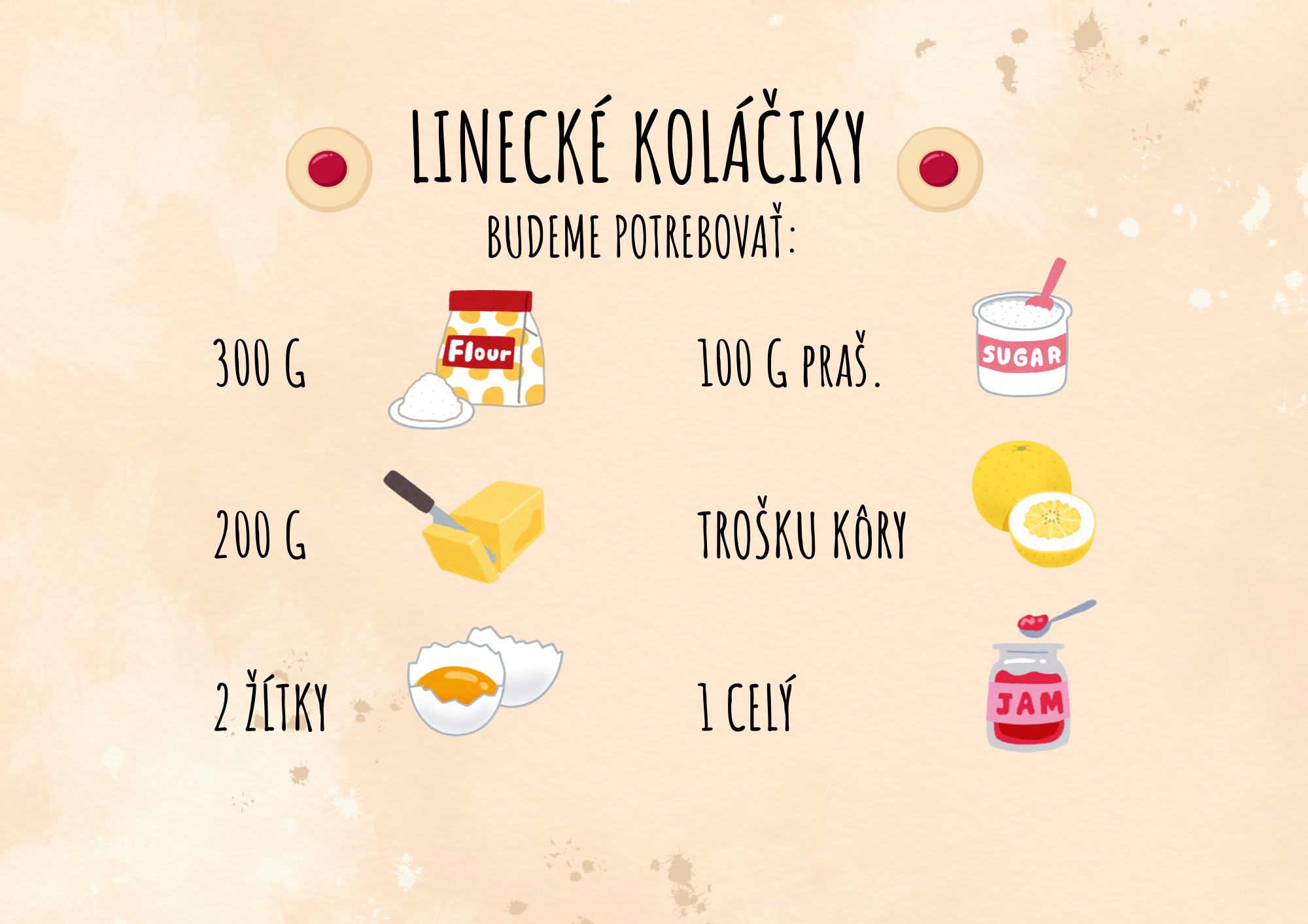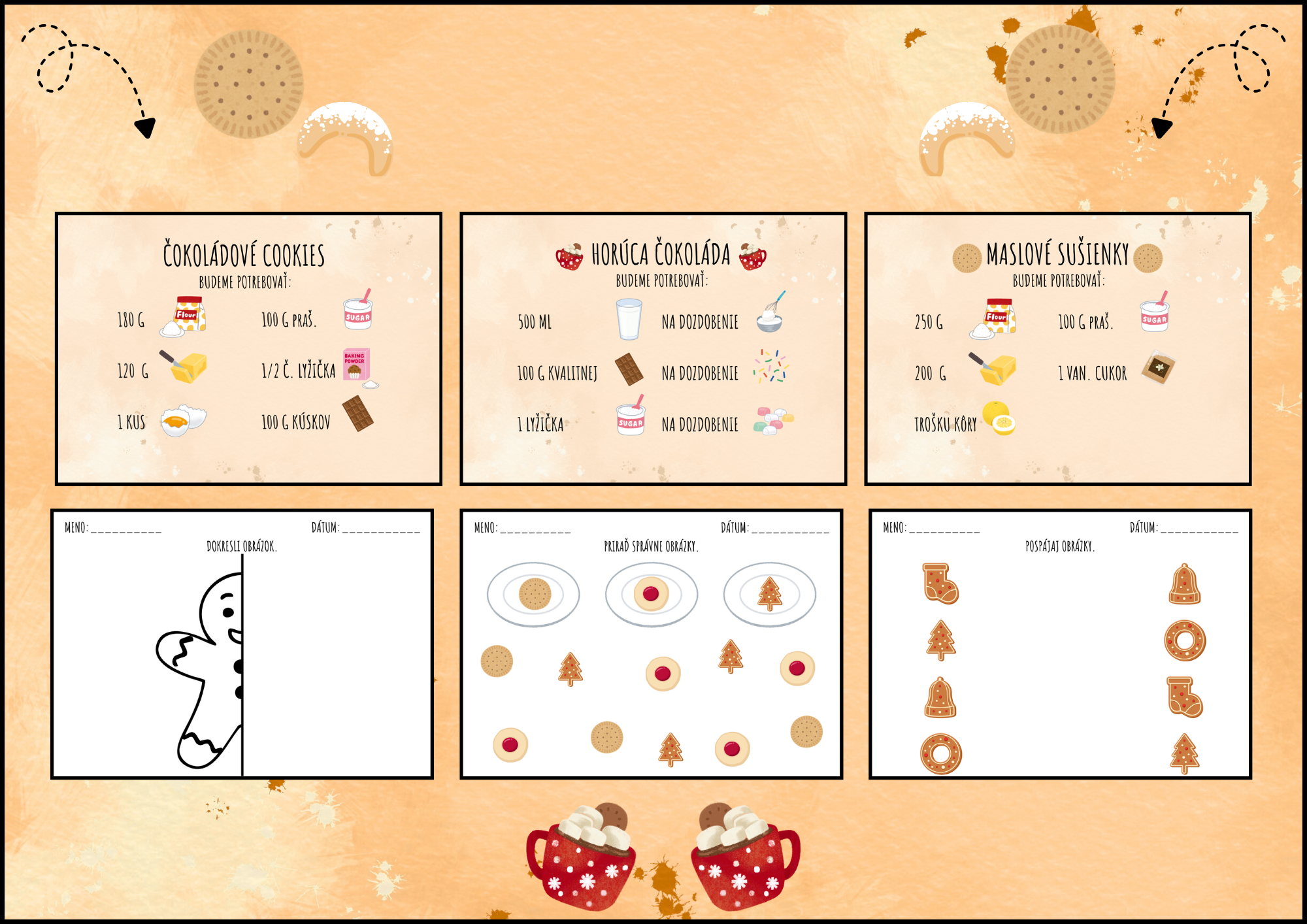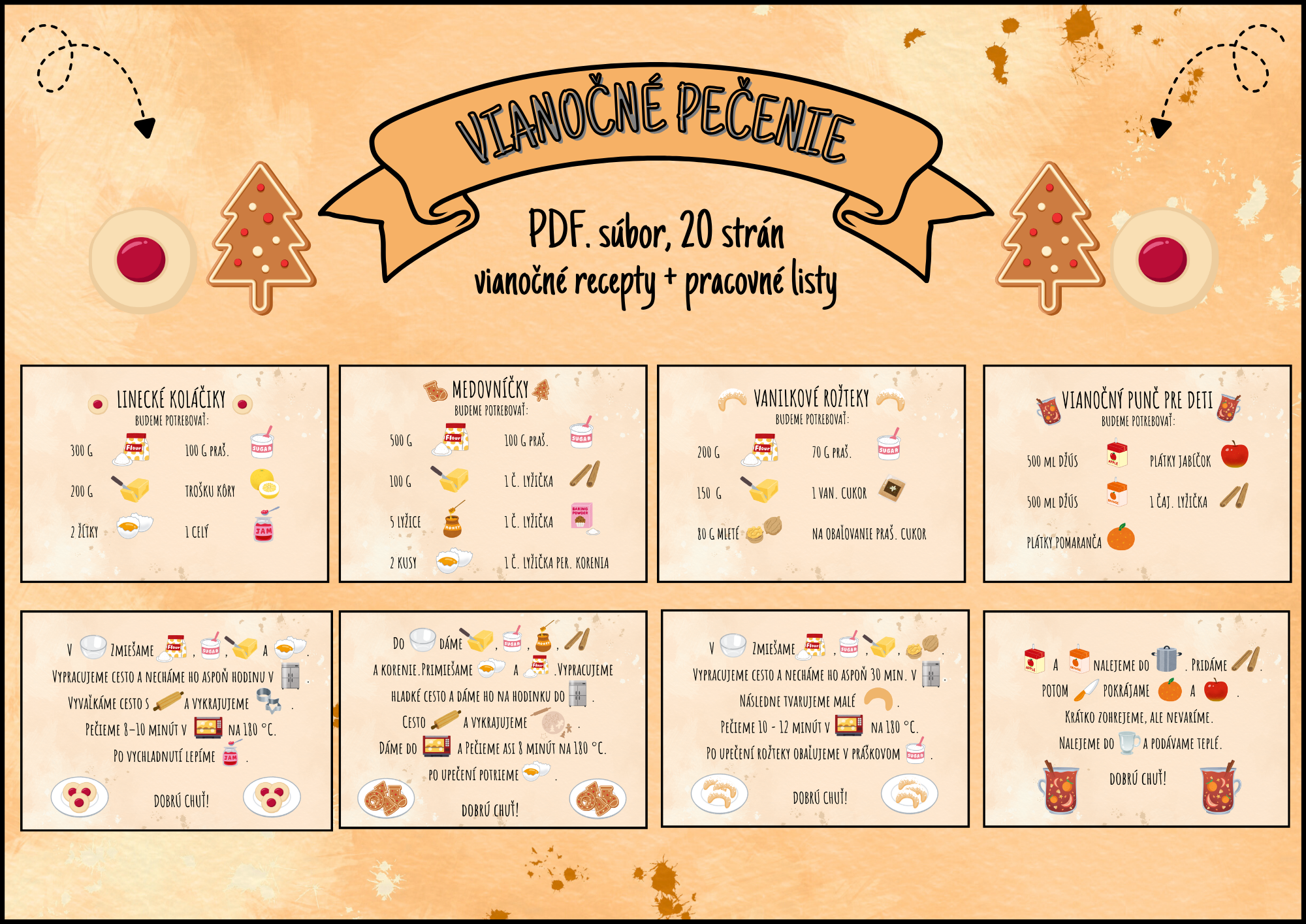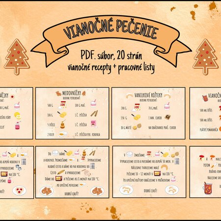 Milé pani učiteľky, milí rodičia a deti, tento súbor je určený na zábavné a kreatívne spoznávanie vianočných receptov. Obsahuje 20 strán s jednoduchými a hravými receptami + pracovné listy, ktoré si deti môžu pripraviť s pomocou dospelých. Recepty sú písané v štýle maľovaného čítania – s obrázkami a jednoduchým popisom krokov, aby deti mohli samé sledovať postup. Každý recept obsahuje jednoduché ikony a obrázky, ktoré uľahčujú porozumenie. V súbore nájdete recepty ako - medovníčky, linecké koláčiky, vanilkové rožteky, vianočný detský punč, maslové sušienky, čokoládové cookies, horúca čokoláda. Rodičia a učitelia môžu použiť súbor ako pomôcku pri spoločnom pečení a tvorení. Užite si pečenie, tvorenie a Vianoce plné radosti a chutí!