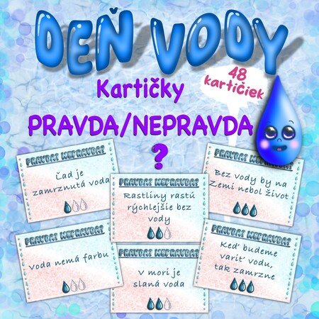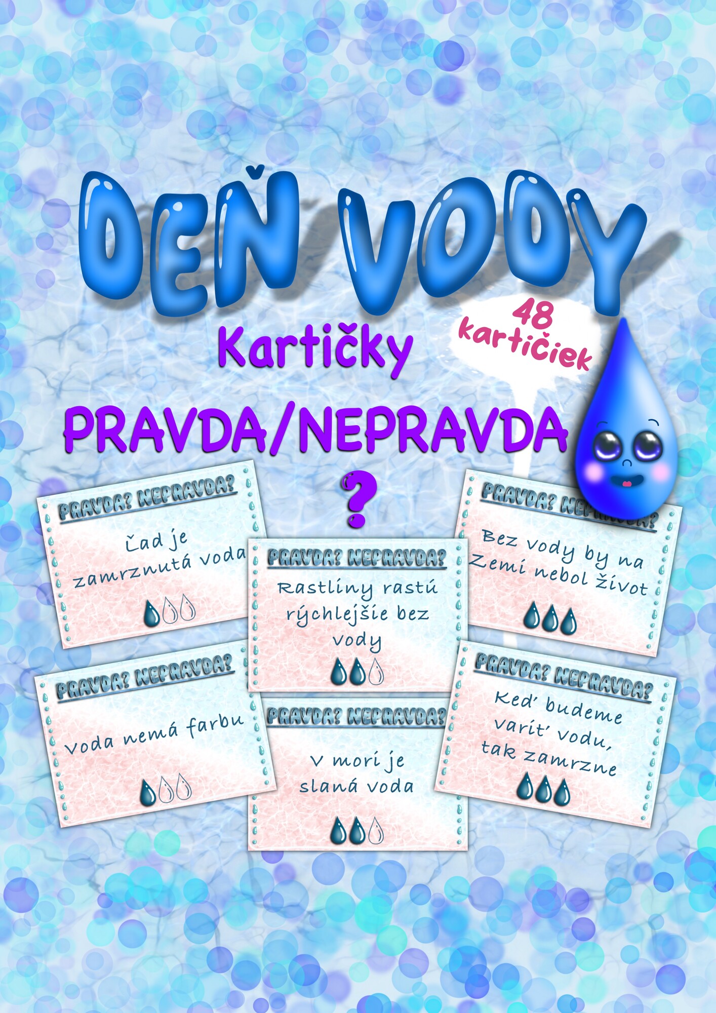 Didaktická hra PRAVDA/NEPRAVDA ku Svetovému dňu vody. 48 kartičiek s výrokmi, pri ktorých deti určujú ich pravdivosť či nepravdivosť. Pre MŠ, 1. stupeň ZŠ, aj na doma.
