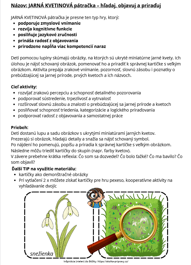 Deti pomocou lupiny skúmajú obrázky, na ktorých sú ukryté miniatúrne jarné kvety. Ich úlohou je nájsť schovaný obrázok, pomenovať ho a priradiť k správnej kartičke s veľkým obrázkom. Aktivita prepája zrakové vnímanie, pozornosť, slovnú zásobu i poznatky o prebúdzajúcej sa jarnej prírode, prvých kvetoch a ich názvoch.
