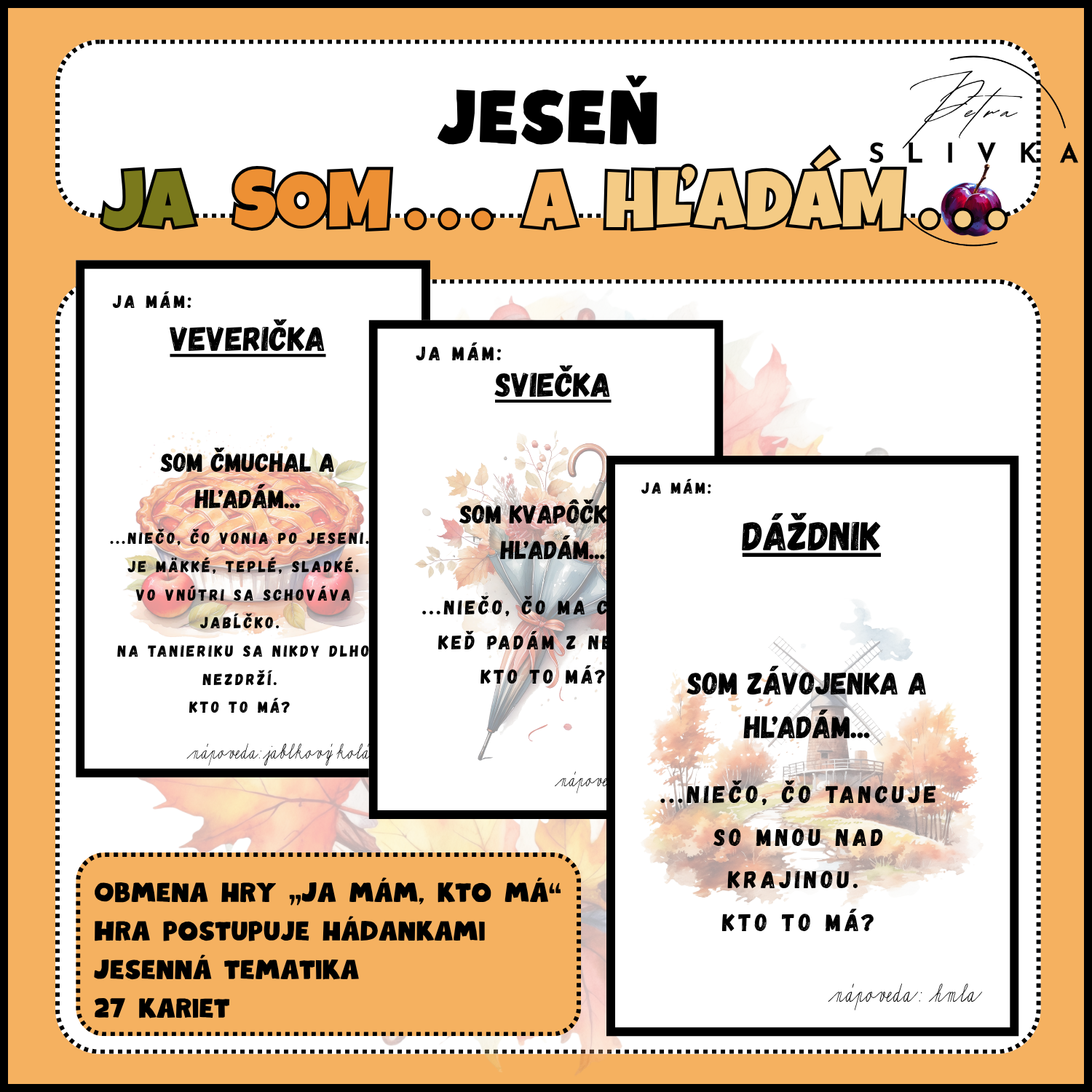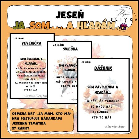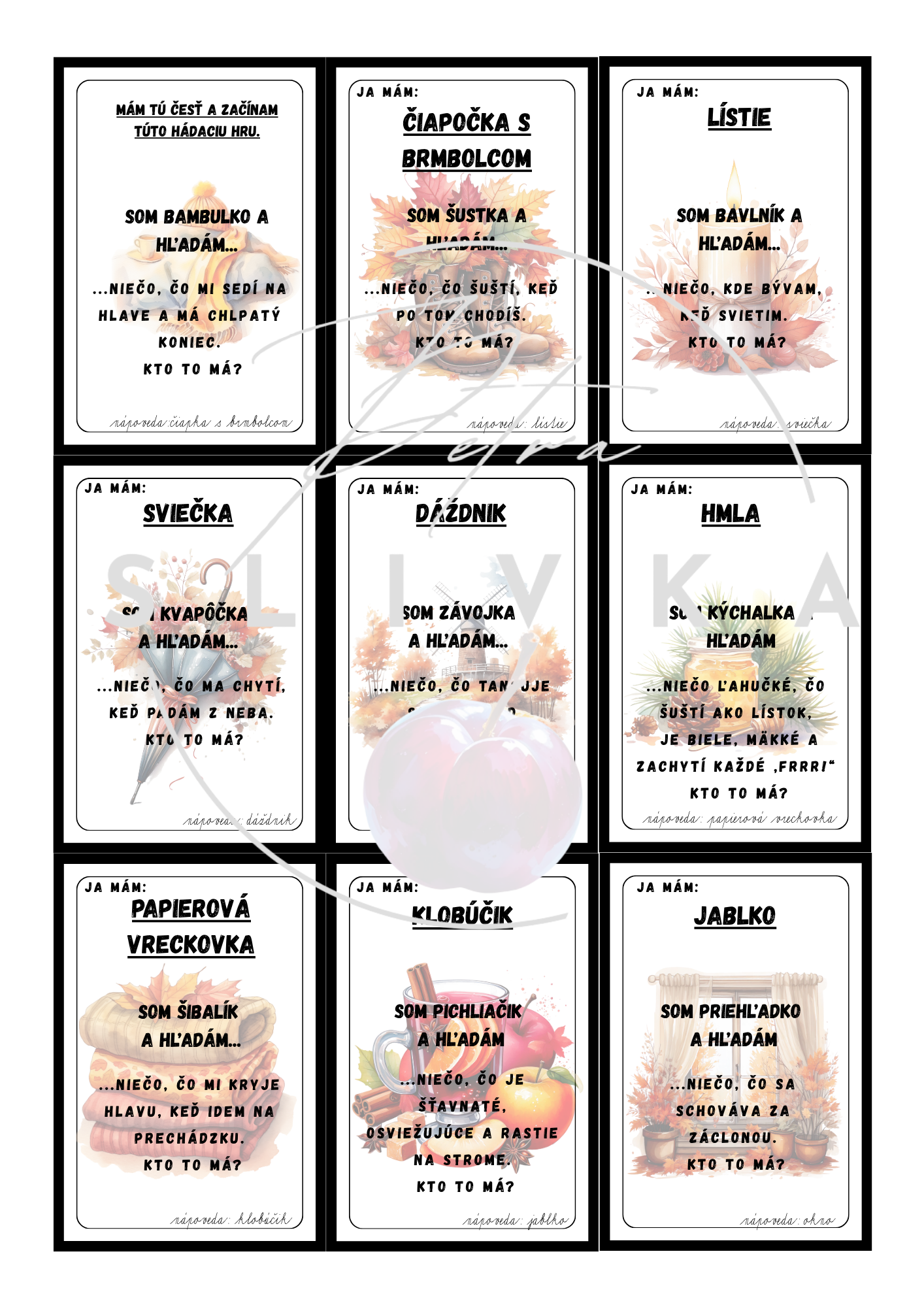 Každá karta predstavuje jesennú postavičku a obsahuje hádanku, ktorá vedie k ďalšej karte.