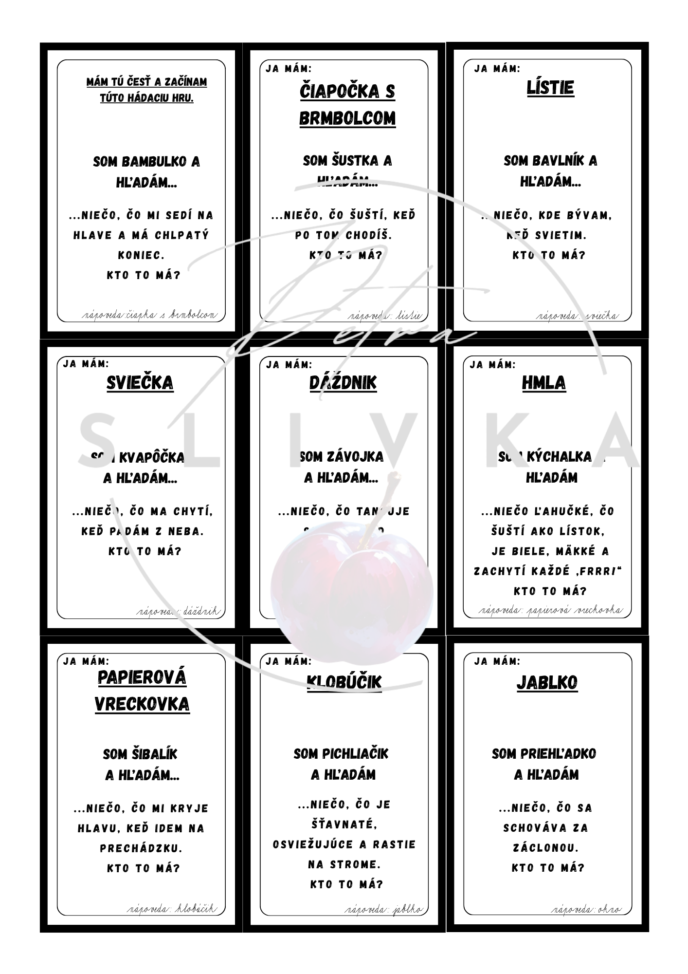 Hráči si odovzdávajú slovo podľa toho, kto uhádne, čo sa skrýva za hádankou – hra tak vytvára plynulý reťazec, kde každá karta nadväzuje na predchádzajúcu.
