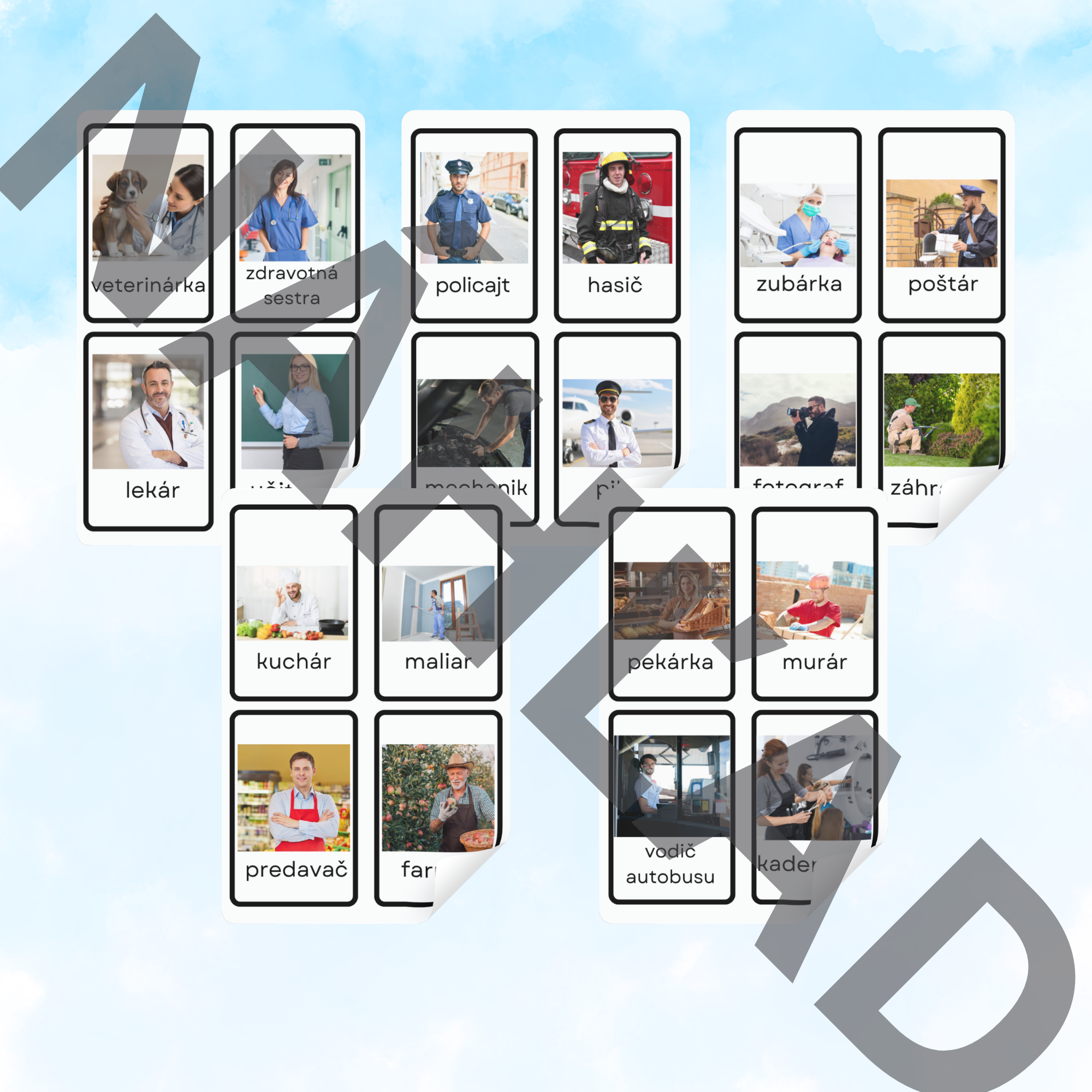 Materiál obsahuje kartičky s rôznymi povolaniami. Kartičky pomáhajú deťom spoznávať jednotlivé povolania a rozširovať slovnú zásobu hravou formou.