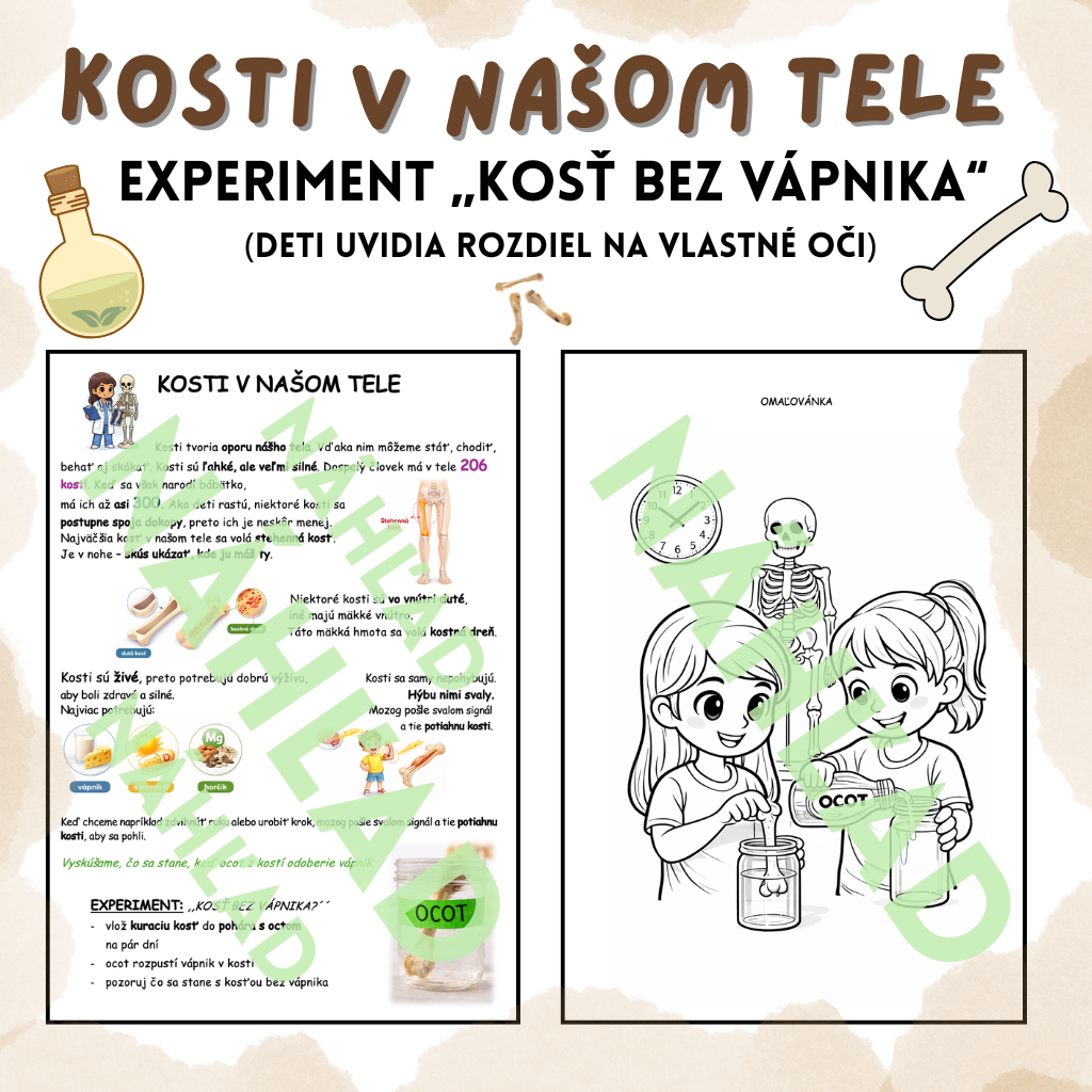 Zážitková aktivita, pri ktorej deti spoznávajú význam kostí v našom tele a ich zloženie. Pomocou jednoduchého experimentu zisťujú, čo sa stane, keď sa z kosti odstráni vápnik.