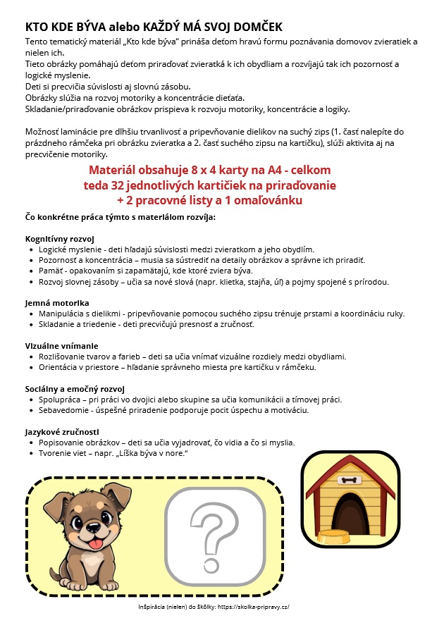 Tento tematický materiál „Kto kde býva“ prináša deťom hravú formu poznávania domovov zvieratiek a nielen ich.