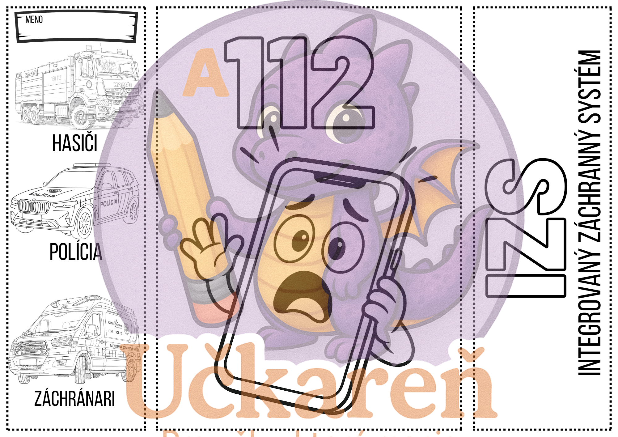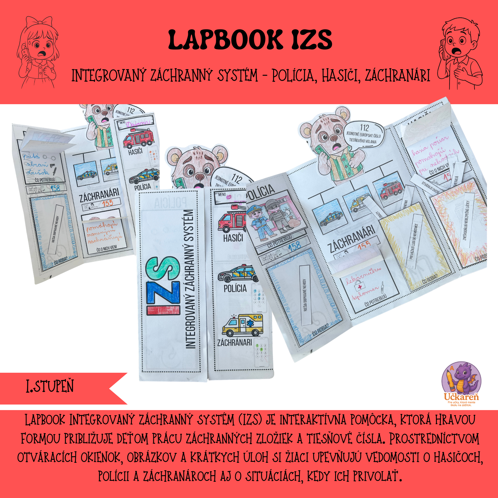 Súbor je zameraný na tému Integrovaný záchranný systém a slúži ako interaktívna didaktická pomôcka pre žiakov 1. stupňa ZŠ. Obsahuje prvky lapbooku s otváracími okienkami, obrázkami a jednoduchými textami, prostredníctvom ktorých sa deti oboznamujú so zložkami IZS – políciou, hasičmi a záchranármi, s ich úlohami, potrebným vybavením a so správnym používaním tiesňových čísel vrátane čísla 112. Materiál podporuje názorné učenie, aktívne zapojenie žiakov a rozvoj čitateľskej gramotnosti. Aktivita je vhodná na individuálnu prácu žiakov pričom učiteľ vystupuje v úlohe sprievodcu a moderátora diskusie. Dôraz sa kladie na porozumenie, správne pomenovanie situácií, v ktorých je potrebné privolať pomoc, a na upevnenie správnych reakcií v krízových situáciách.S materiálom sa pracuje postupne – po úvodnej motivácii nasleduje vyfarbovanie, vystrihovanie a lepenie jednotlivých častí lapbooku. Žiaci otvárajú okienka, čítajú krátke texty, priraďujú obrázky k zložkám IZS a slovne vysvetľujú, čo jednotlivé záchranné zložky robia a čo pri svojej práci potrebujú. Na záver sa odporúča spoločná reflexia formou rozhovoru alebo modelových situácií, vďaka ktorej si žiaci upevnia získané poznatky a prepoja ich s reálnym životom.