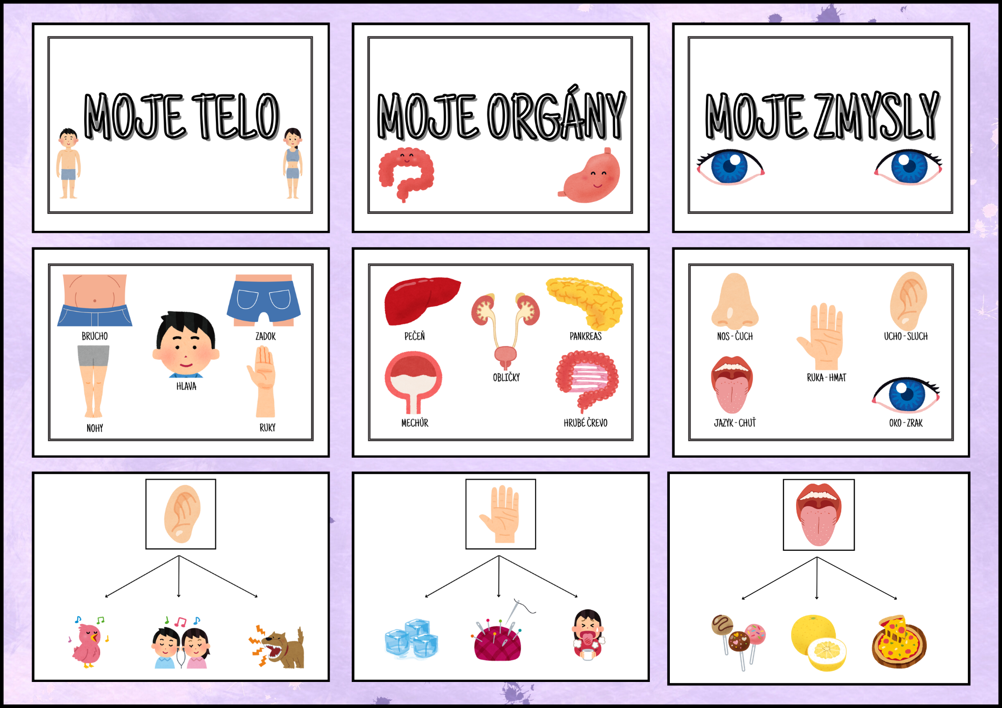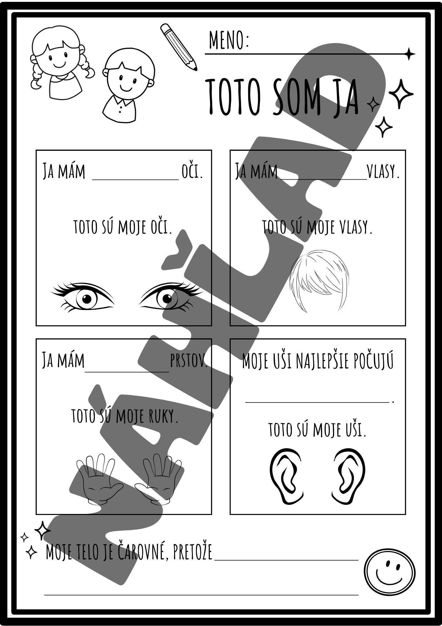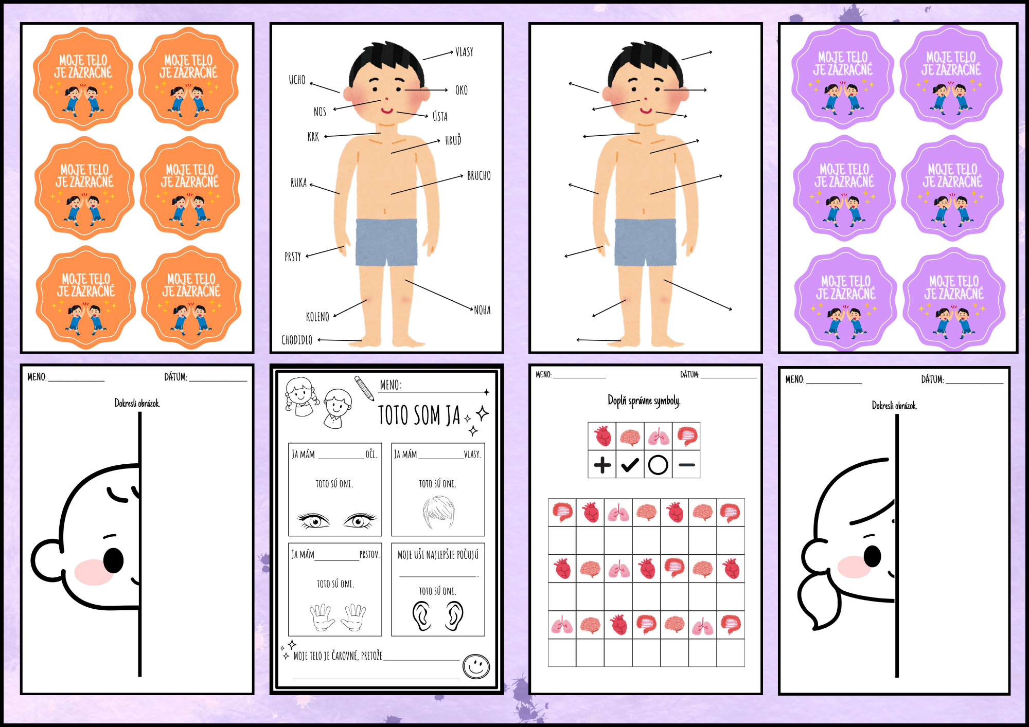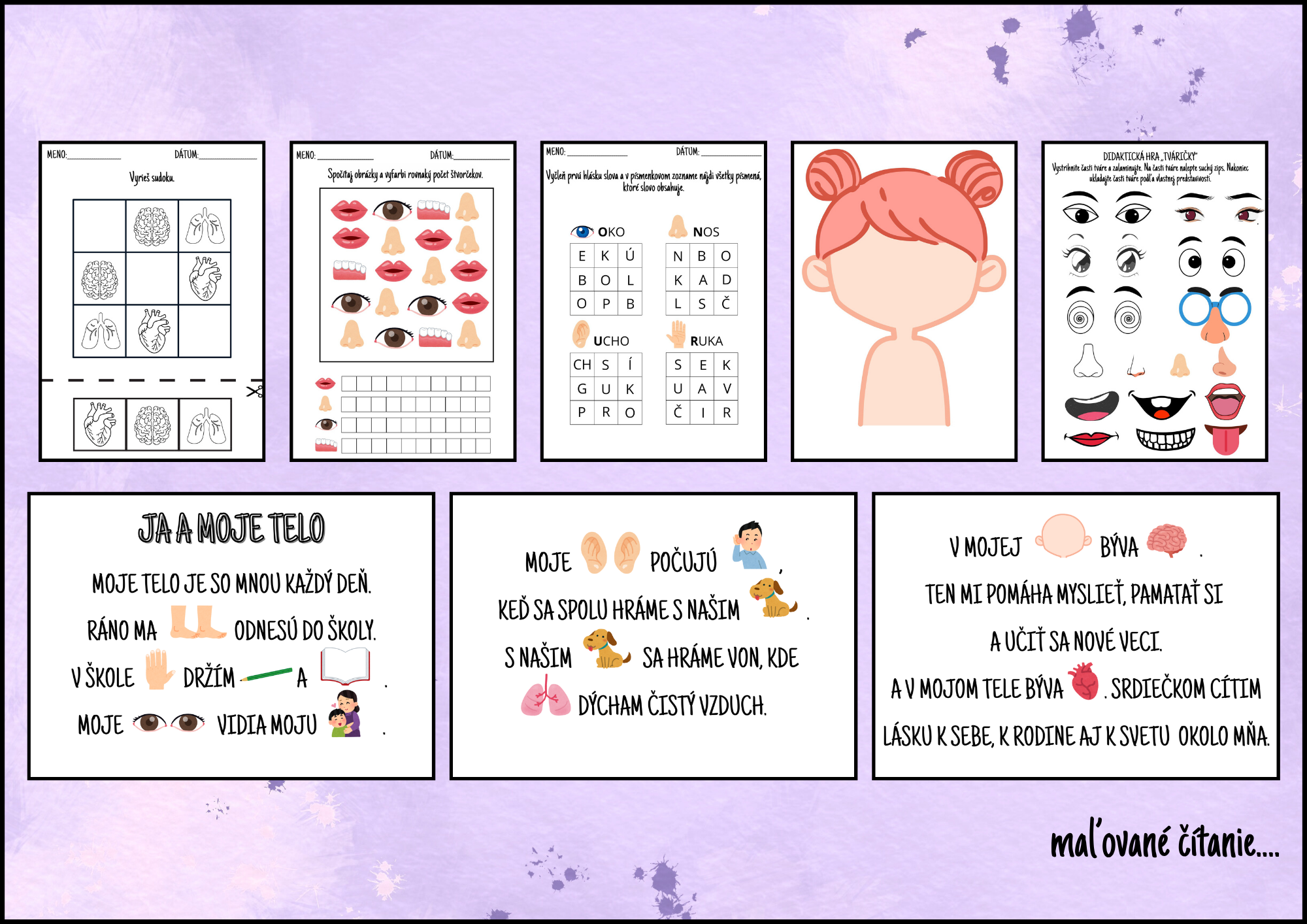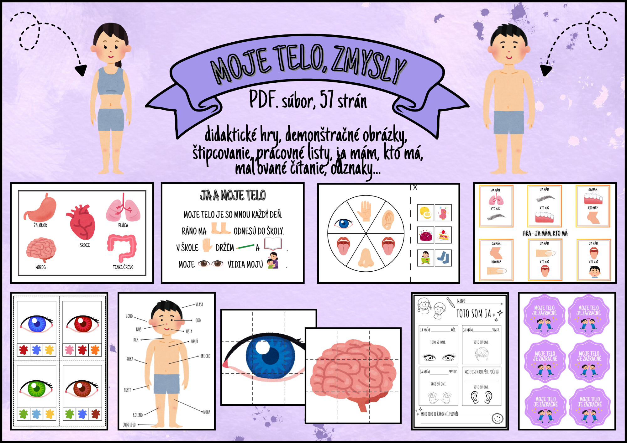 Milé pani učitel'ky, vychovávateľky, rodičia. Pripravila som si pre vás 57 strán pracovných listov na tému „Moje telo, zmysly”.V tomto PDF. súbore nájdete: