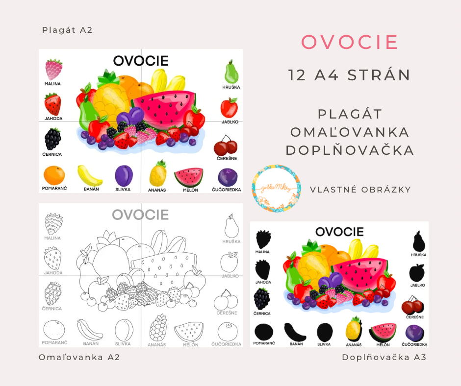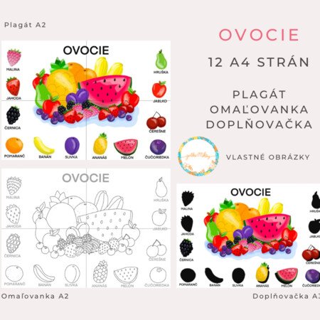- 4 čiernobiele strany po vystrihnutí a zlepení vytvoria veľkú omaľovánku o veľkosti cca A2. Deti si okrem vymaľovania obrázkov môžu precvičiť písanie a obtiahnuť názvy ovocia,