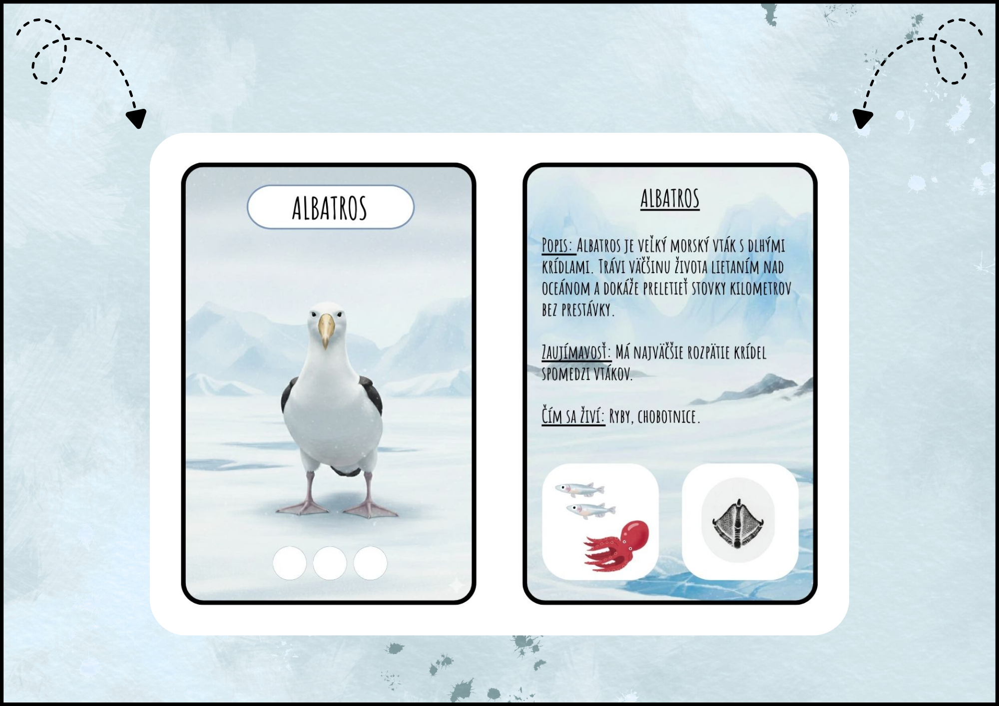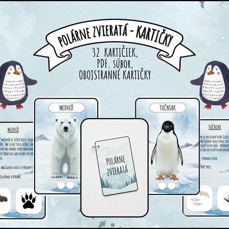 Kartičky umožňujú prehľadným a hravým spôsobom spoznať polárne zvieratá a ich vzťah k prostrediu, pričom učenie podporujú ilustrácie potravy a stôp.