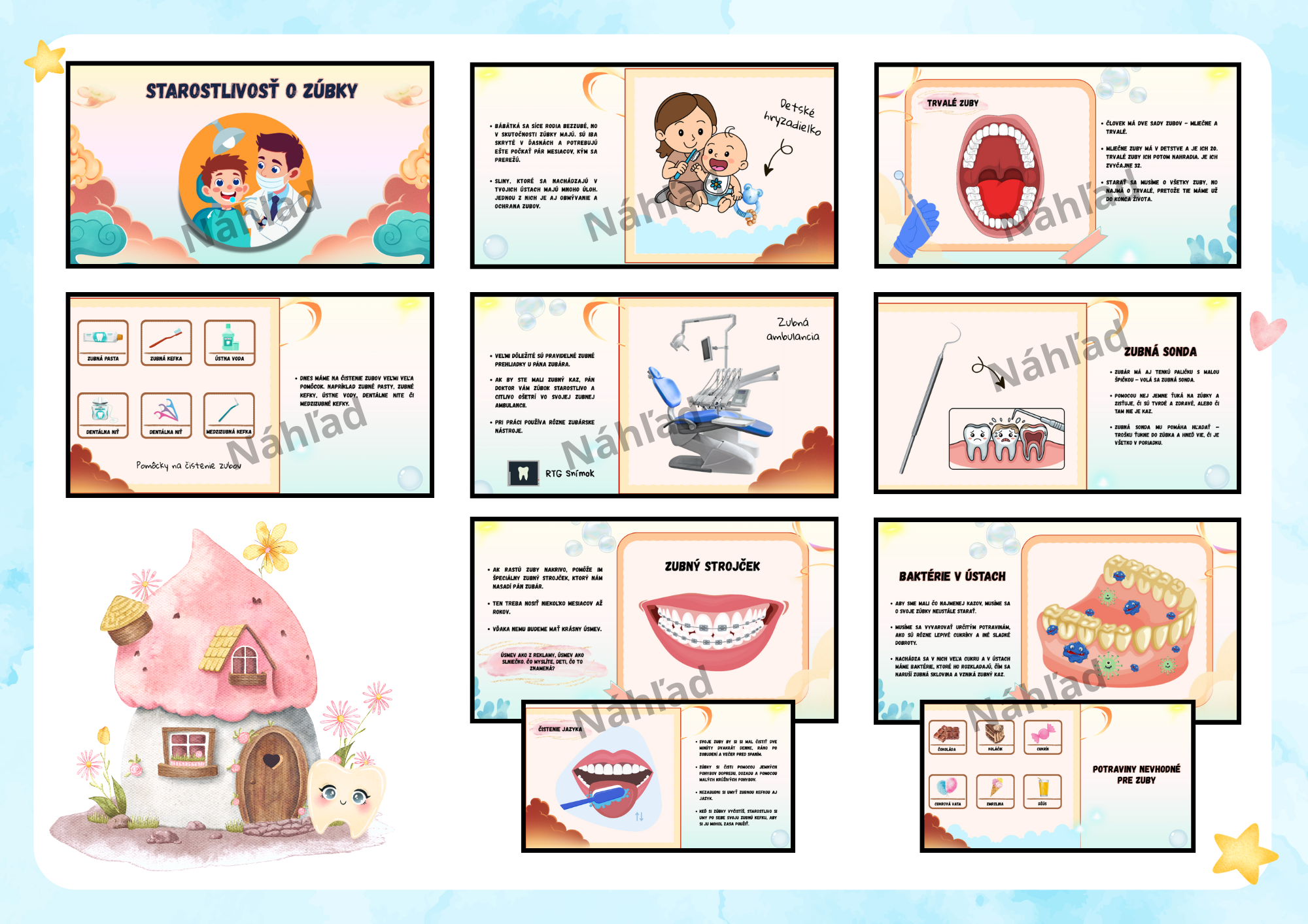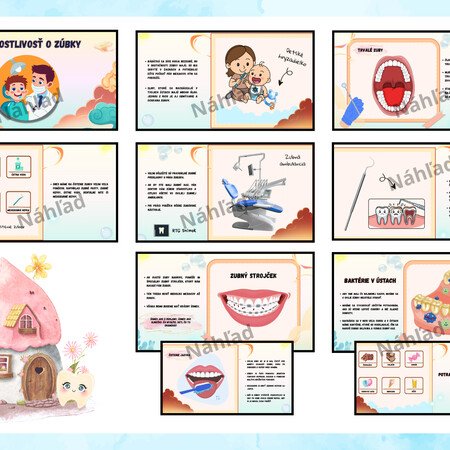 Cieľom prezentácie je hravou a veku primeranou formou oboznámiť deti so základmi starostlivosti o zuby, významom ústnej hygieny a prevencie. Deti získajú základné poznatky o tom, prečo je dôležité pravidelne si čistiť zúbky, aký je význam preventívnych prehliadok u zubného lekára, ktoré potraviny zúbkom prospievajú a ktoré im škodia. Zároveň sa oboznámia so základnými informáciami o vývoji chrupu – od narodenia až po výmenu mliečnych zubov za trvalé. Cieľom je viesť deti k zodpovednosti za svoje zdravie a vytvárať pozitívny postoj k starostlivosti o svoje zuby už od útleho veku.