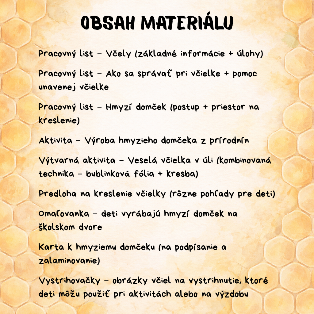 Hravý a zážitkový vzdelávací materiál, ktorý vedie deti k poznávaniu včiel a hmyzu priamo v prírode. Žiaci sa zoznámia so životom včiel, ich významom pre prírodu a naučia sa, ako sa správať v ich blízkosti. Súčasťou materiálu je aj praktická aktivita – výroba hmyzieho domčeka z prírodnín, ktoré nájdu v okolí školy, výtvarná aktivita s predlohou na tvorbu včielky a vystrihovačky hmyzu, ktoré môžu deti využiť pri aktivitách alebo na výzdobu.