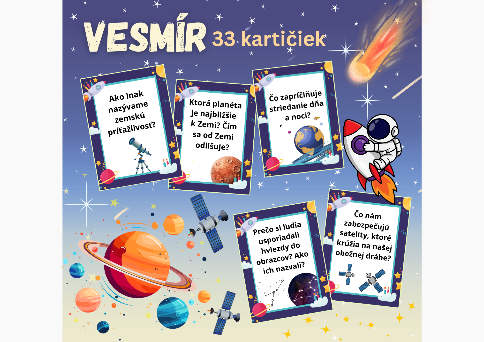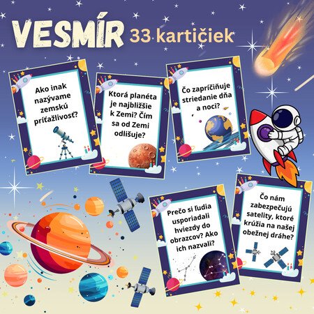 - 33 tematických kartičiek z oblasti vesmíru