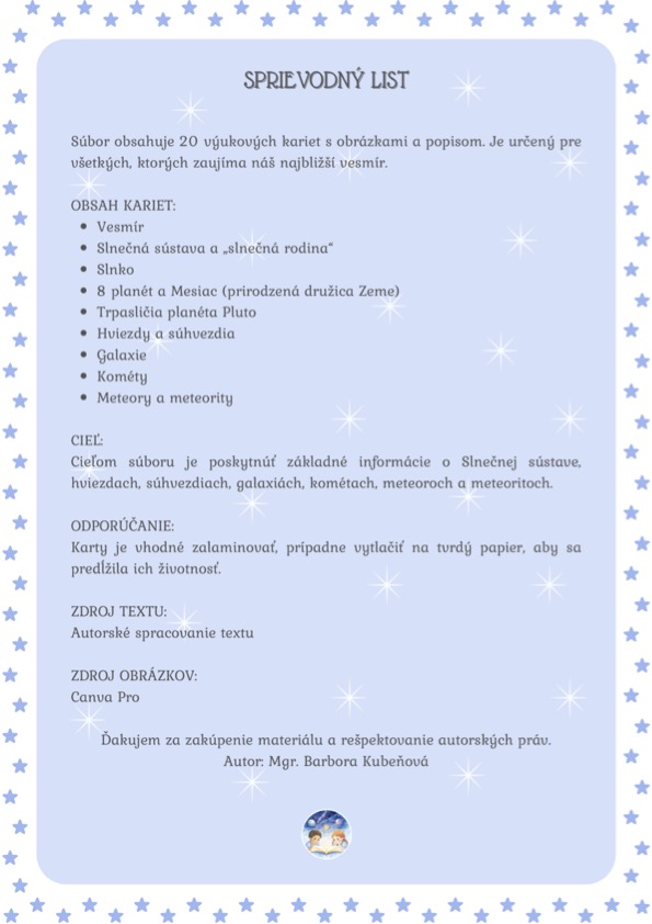 VIEŠ, KEDY VZNIKOL VESMÍR? Ktorý mesiac je v Slnečnej sústave najväčší? Aká je teplota na Marse? Ak hľadáte odpovede, potom je tento súbor s výukovými kartami určený práve pre vás. Základné informácie sa dozvie každý bez rozdielu veku.
