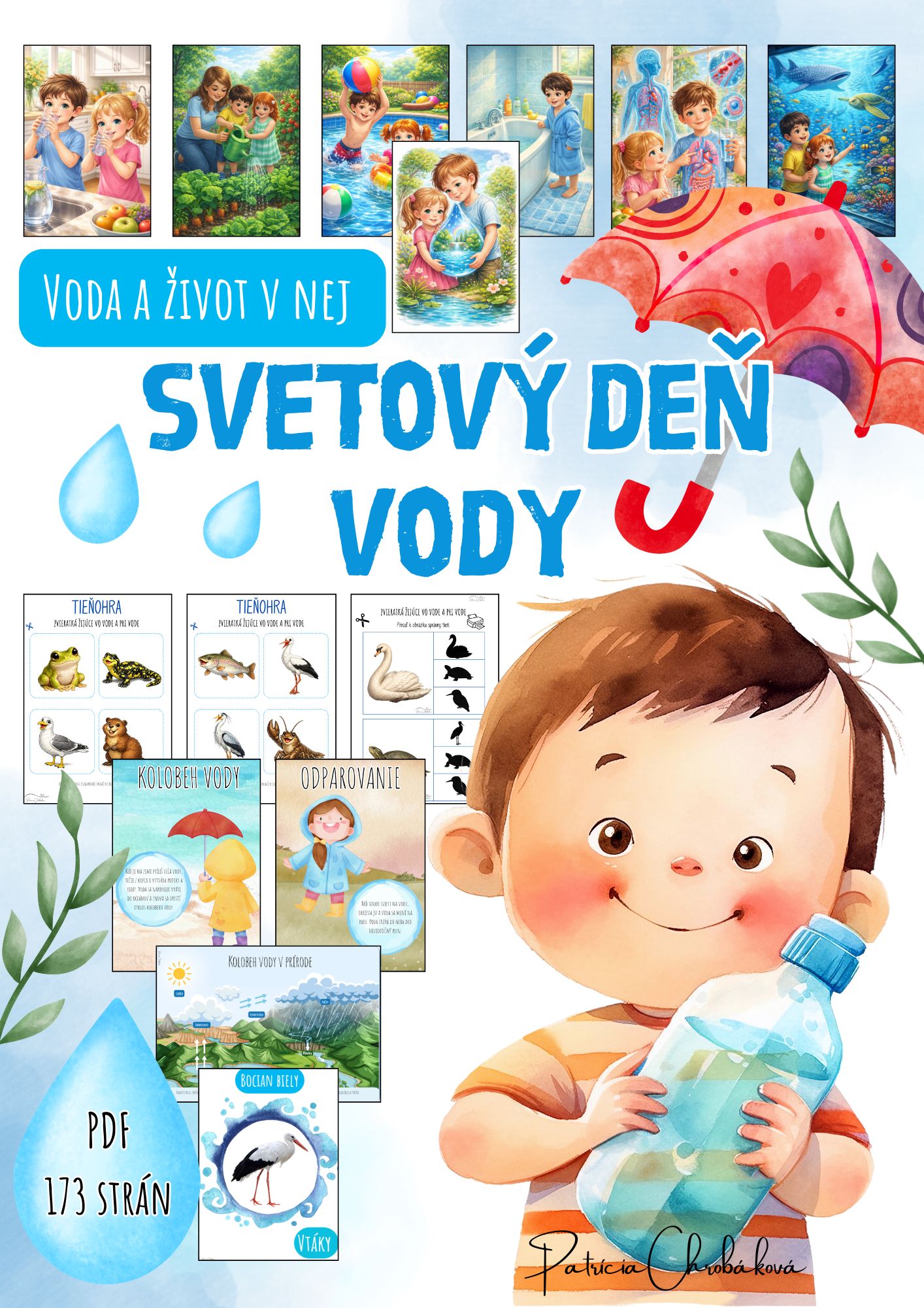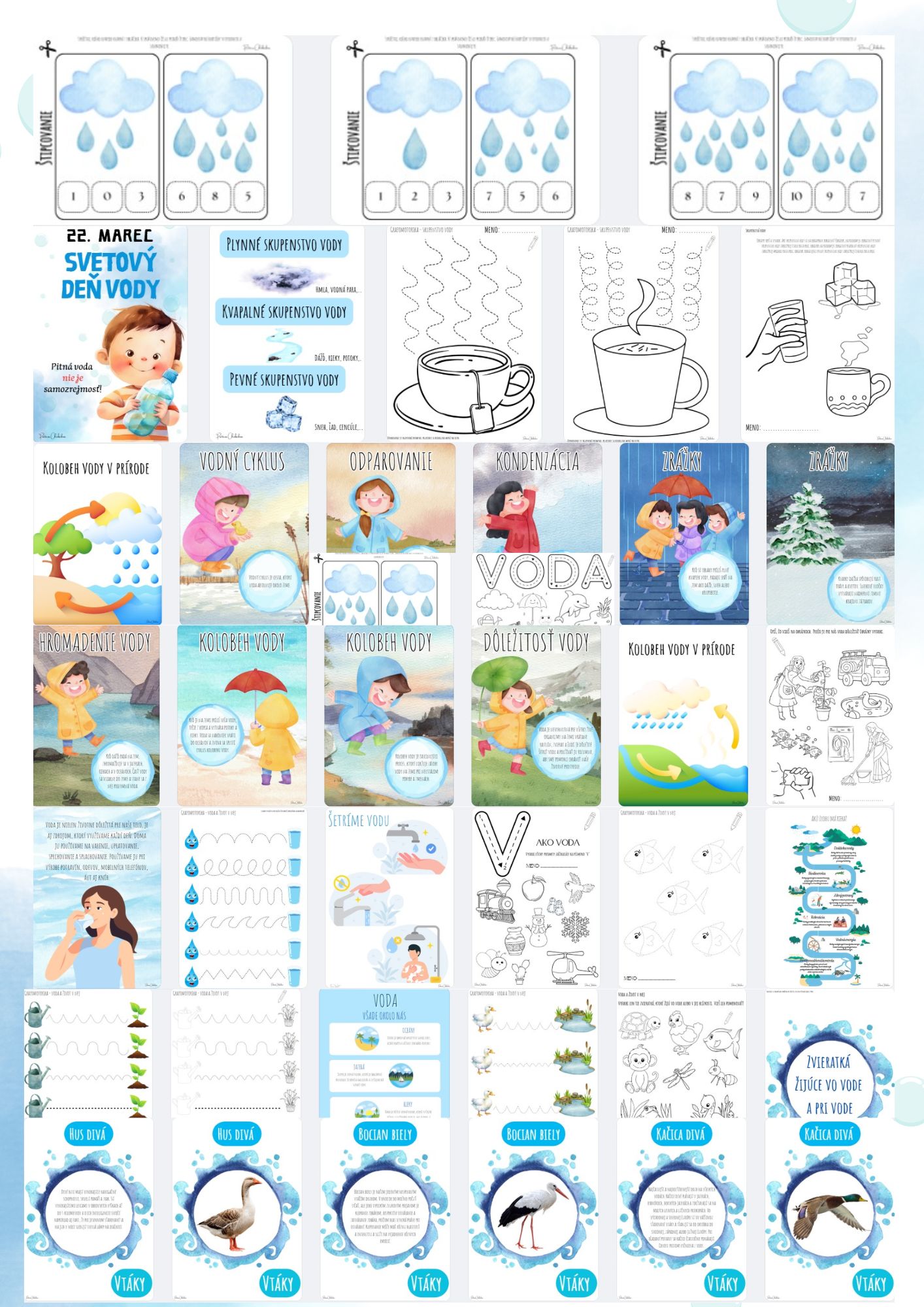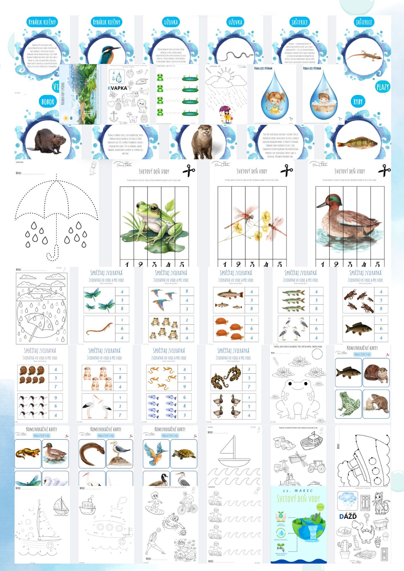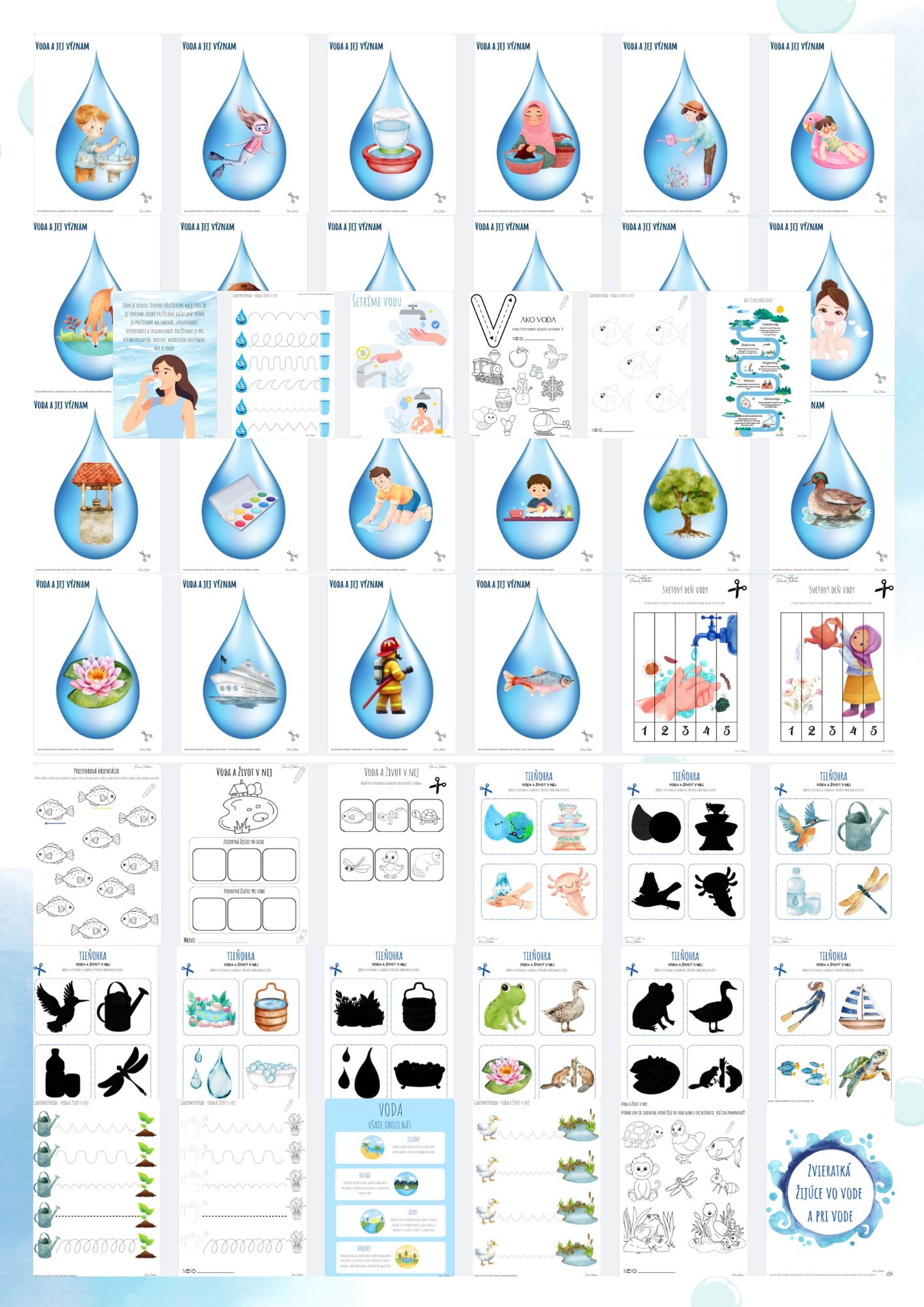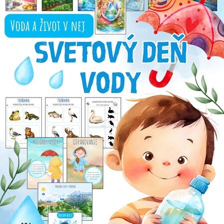 Obsah: Súbor obsahuje 173 strán, pracovné listy zamerané na grafomotoriku, priestorovú orientáciu, jednoduchú matematickú gramotnosť, vyčleňovanie prvej hlásky slova, základné farby, dopĺňanie, komunikáciu,... priraďovacie aktivity, puzzle, tieňohry, štipcovanie, komunikačné kartičky, demonštračné obrázky, materiály vhodné ako výzdoba triedy - plagáty, význam vody pre človeka, rastliny a živočíchov, teoretické oboznámenie sa s danou témou - voda a život v nej, zvieratá žijúce vo vode a pri vode, vodné živočíchy, skupenstvá vody, voda a jej význam, kolobeh vody v prírode, svetový deň vody,...