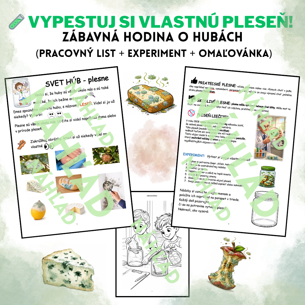 Tento materiál hravou formou približuje deťom svet plesní – kde sa vyskytujú, ktoré sú pre nás užitočné a ktoré škodlivé. Deti sa prostredníctvom obrázkov, diskusie a experimentu učia rozlišovať pleseň v bežnom živote a zároveň si vyskúšajú jednoduchý pokus – vytvoria si vlastnú pleseň.