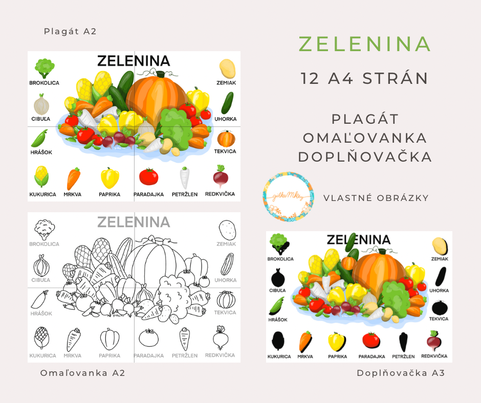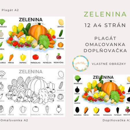 ⁃ 4 čiernobiele strany po vystrihnutí a zlepení vytvoria veľkú omaľovánku o veľkosti cca A2. Deti si okrem vymaľovania obrázkov môžu precvičiť písanie a obtiahnuť názvy zeleniny,