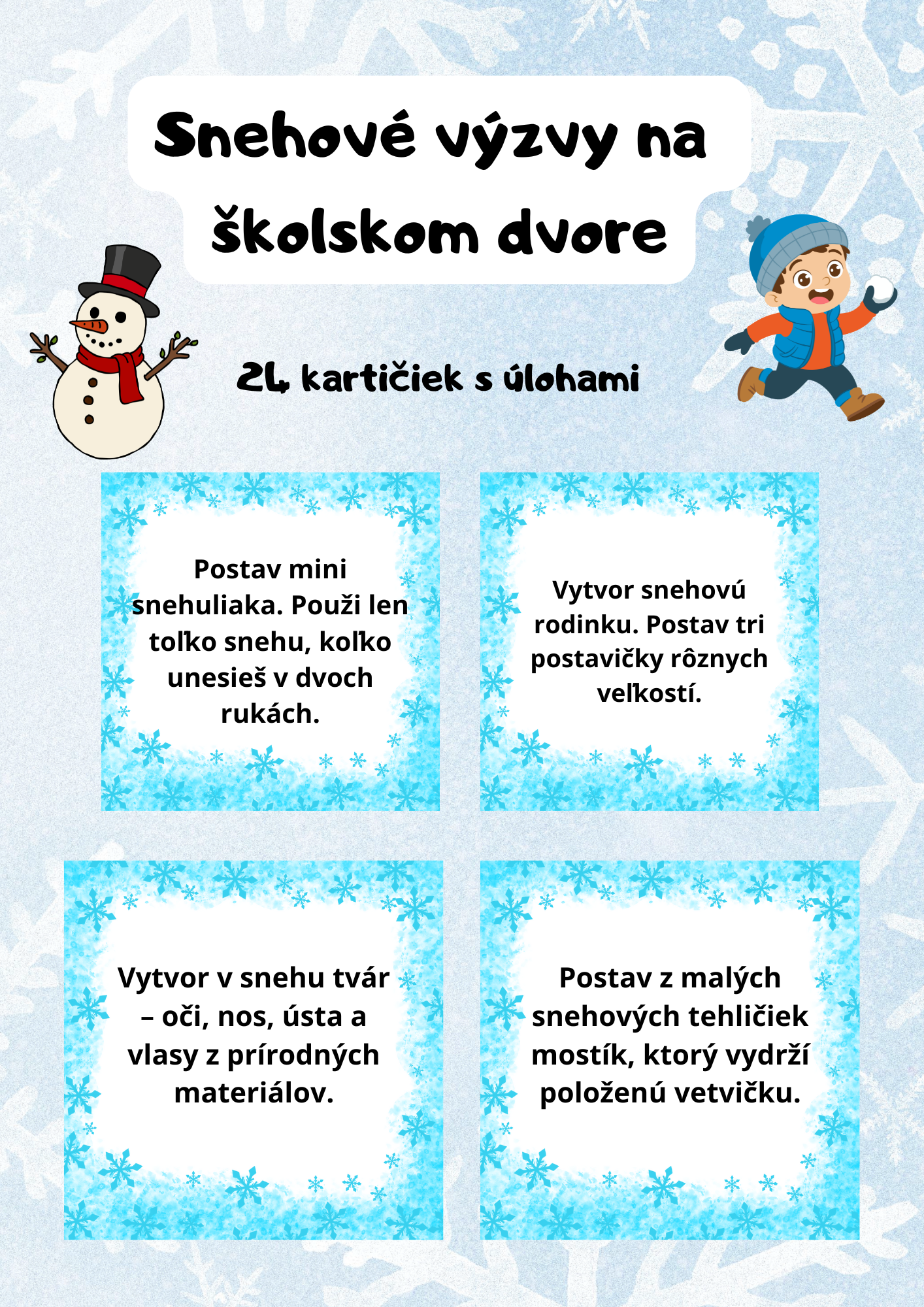 Súbor originálnych úloh na snehu, ktoré rozvíjajú tvorivosť, pohyb aj pozorovanie prírody. Kartičky sú pripravené na okamžité použitie – stačí vyjsť von a zima sa zmení na dobrodružstvo.