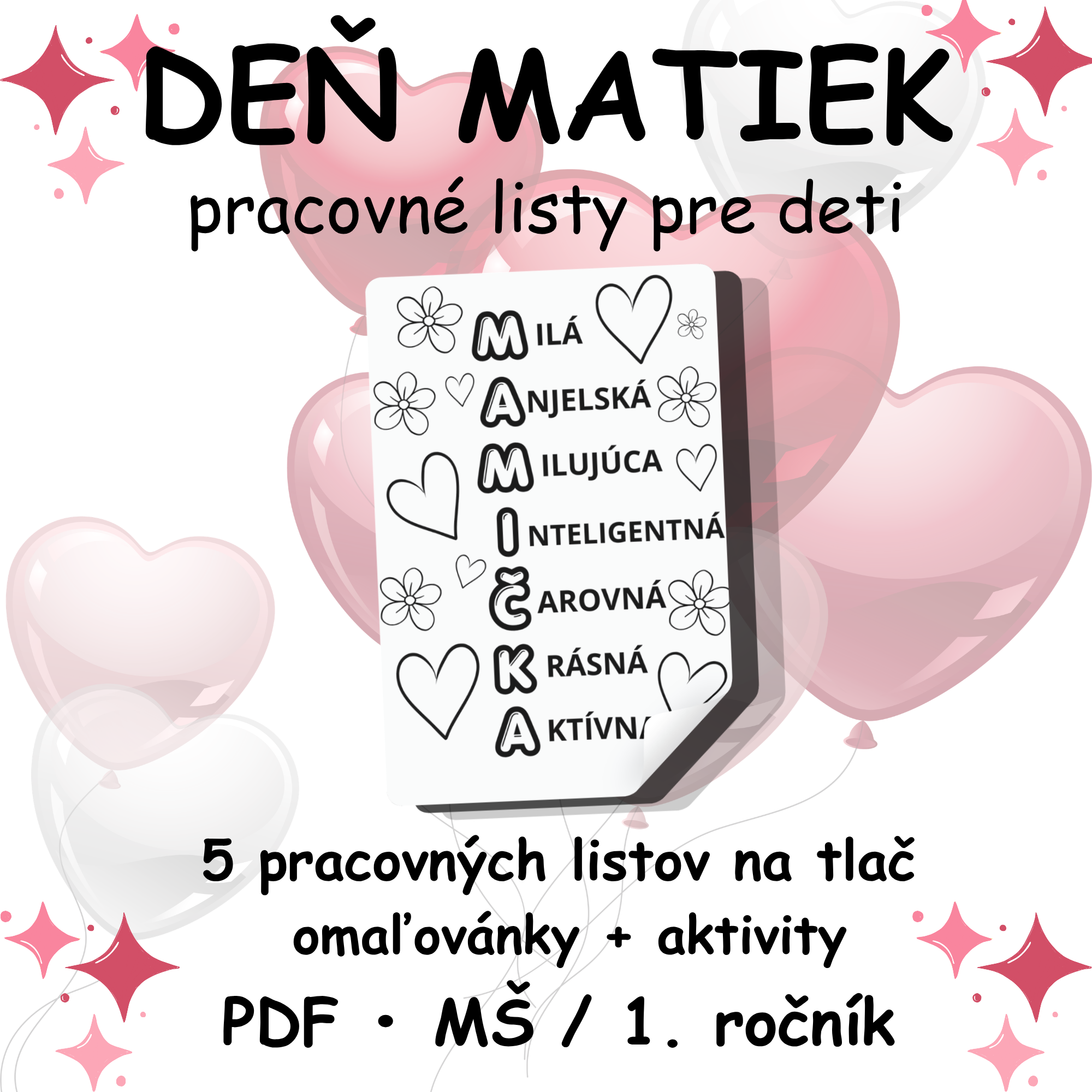 Súbor obsahuje 5 pracovných listov na tému Deň matiek. Materiál je vhodný pre deti v materskej škole a na 1. stupni základnej školy. Deti môžu kresliť, vyfarbovať a dopĺňať informácie o svojej mamičke a vytvoriť malý darček ku Dňu matiek.