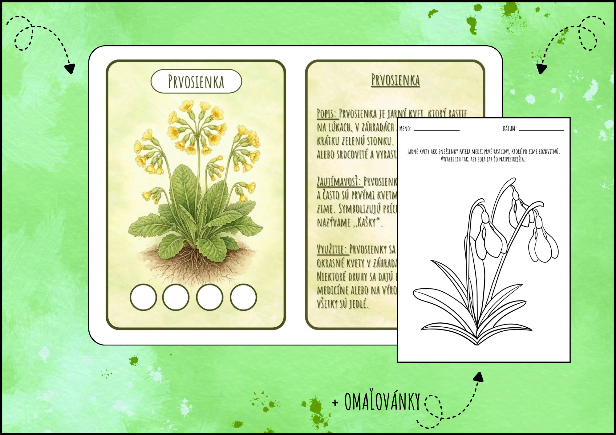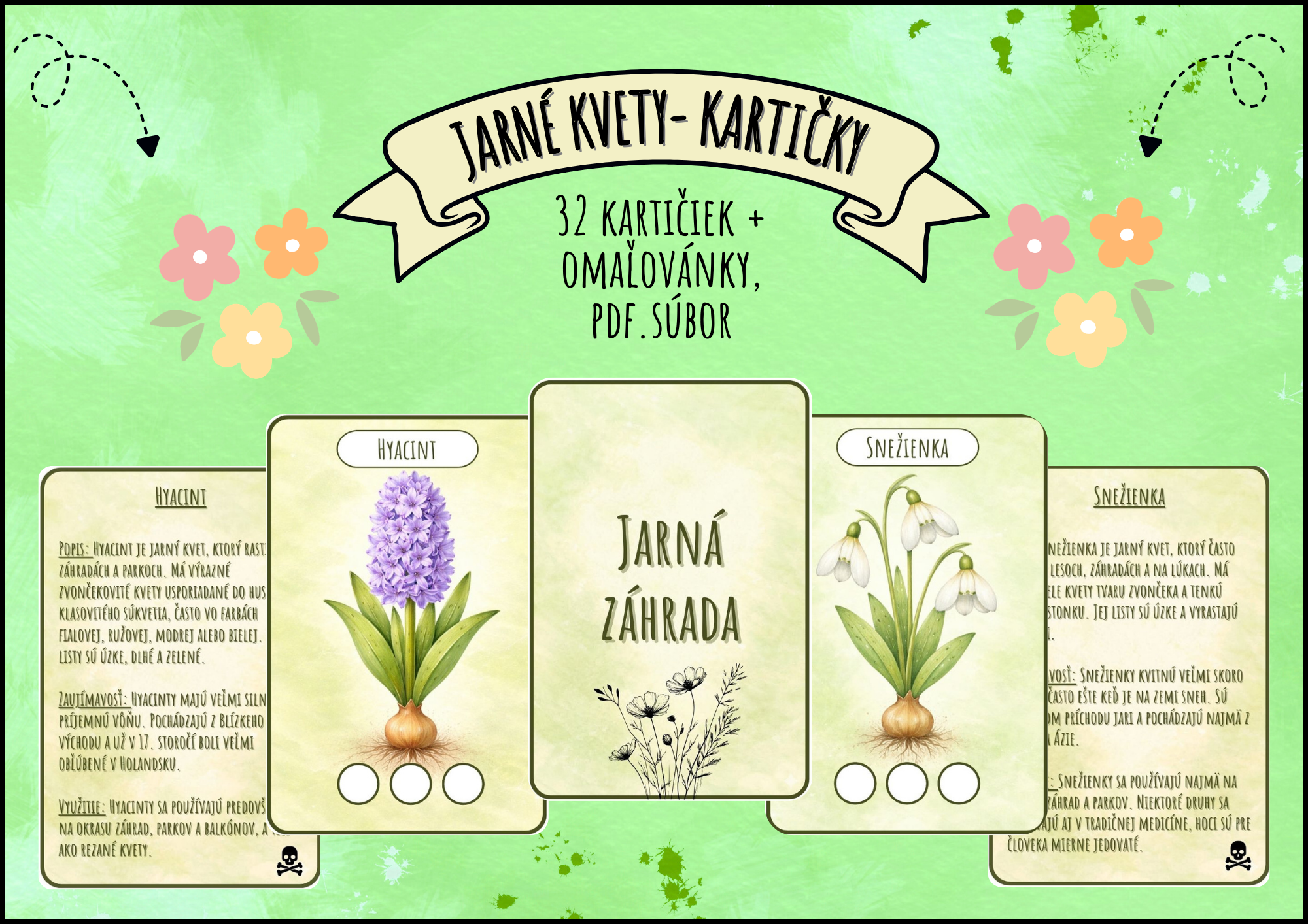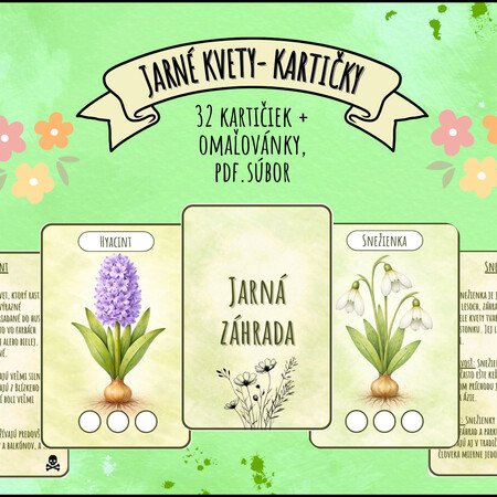 Milé pani učiteľky, páni učitelia, rodičia, táto sada obsahuje 32 kartičiek + omaľovánky, ktoré deťom hravou a zrozumiteľnou formou približujú jarné kvety a jarnú záhradu. Kartičky predstavujú rôzne druhy jarných kvetov, ako sú tulipány, narcisy, snežienky, prvosienky či konvalinky, a pomáhajú deťom spoznávať ich vzhľad, zaujímavosti aj to, na čo sa využívajú.