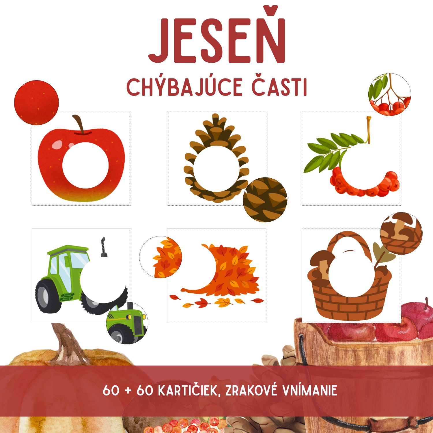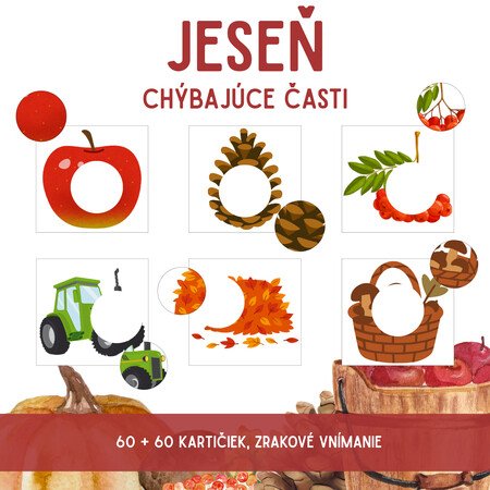 Na každej kartičke je obrázok, v ktorom kúsok chýba (vyznačené bielym kruhom).