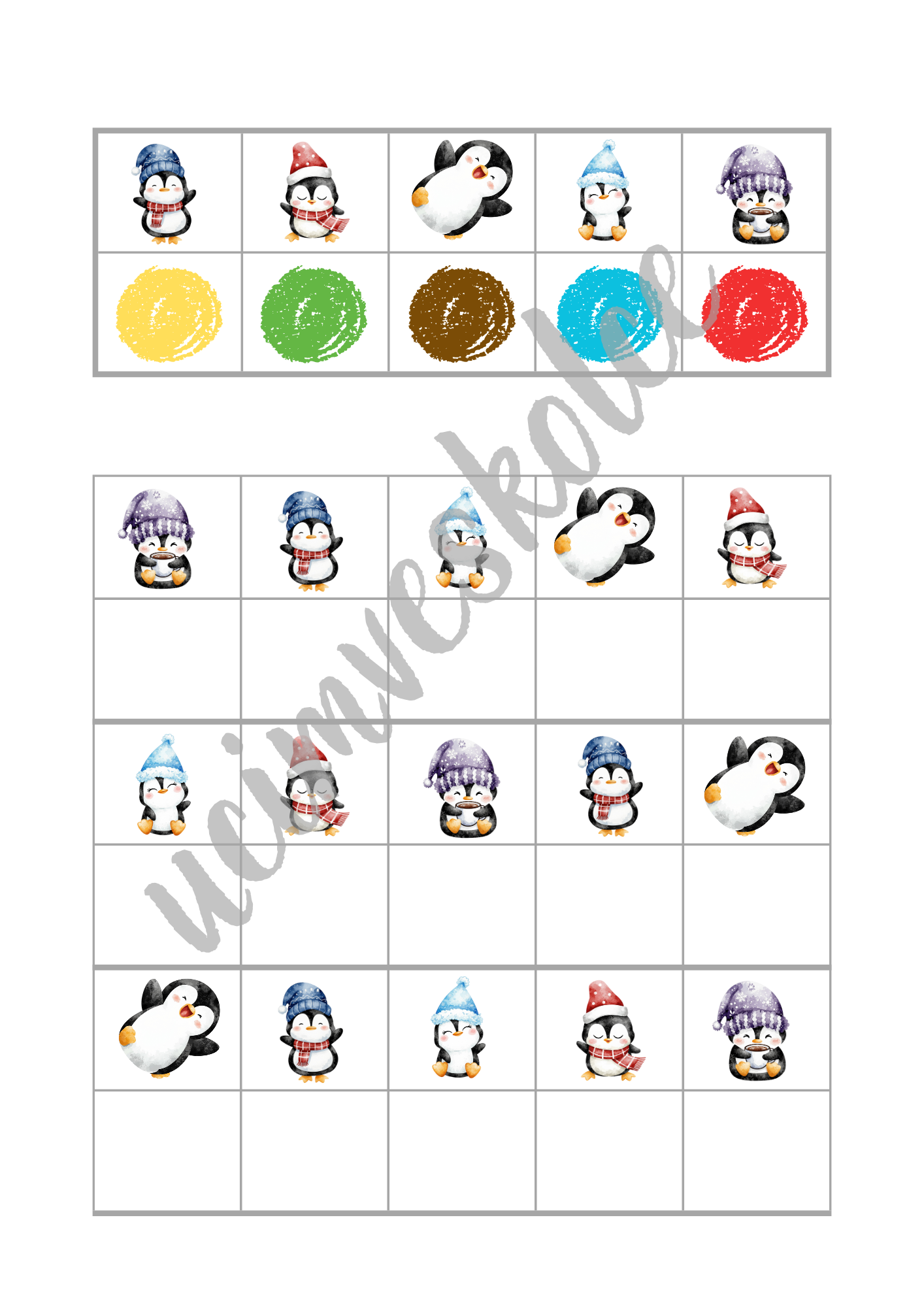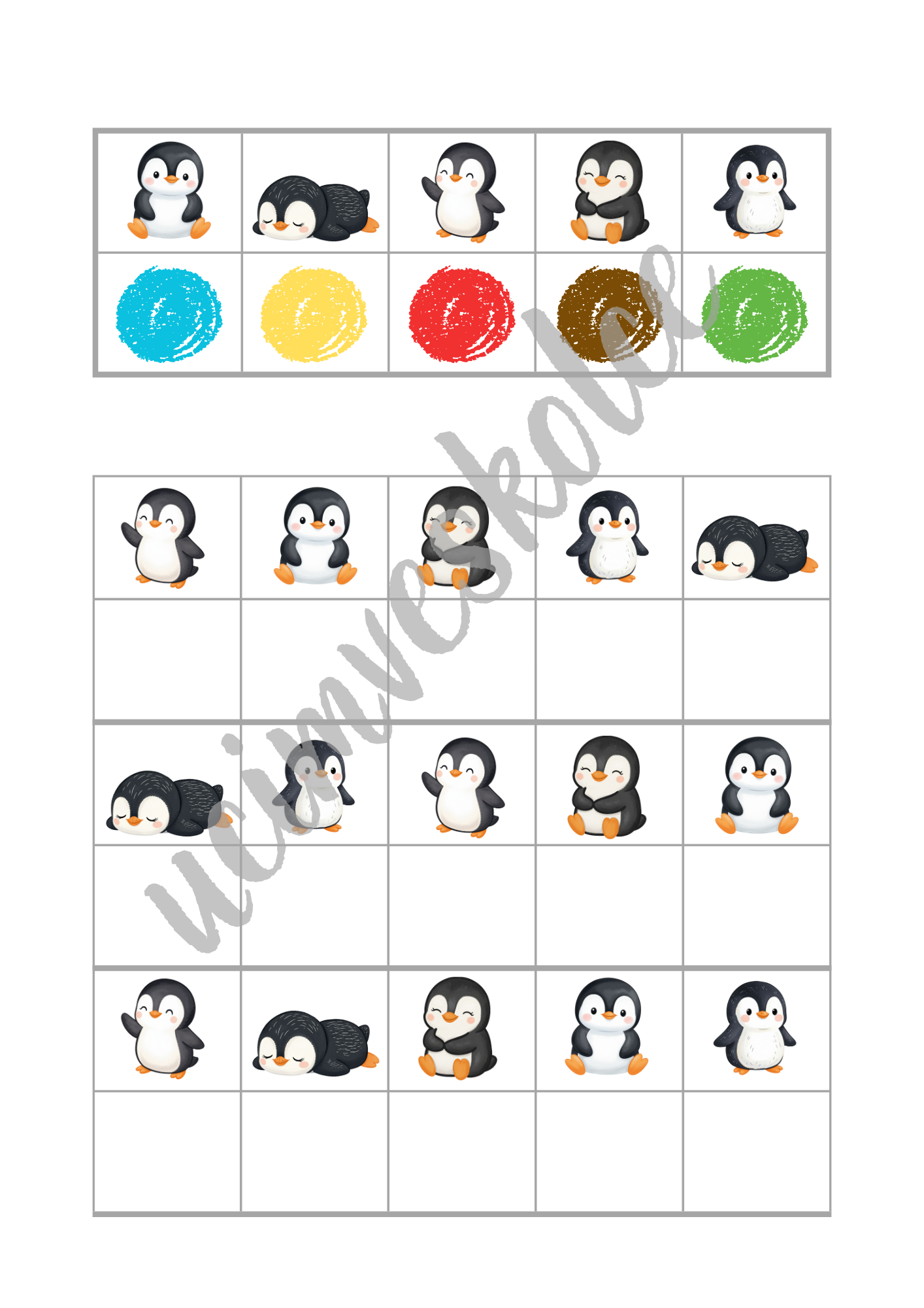 - V druhej tabuľke, ktorá sa nachádza nižšie, je celkom 6 riadkov. V každom nepárnom riadku (prvý, tretí, piaty) je 5 políčok s obrázkami tučniakov. V každom párnom riadku (druhý, štvrtý, šiesty) je 5 prázdnych políčok.