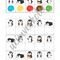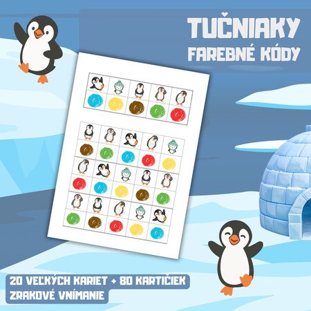 - Prvá tabuľka je v hornej časti. V prvom riadku tejto tabuľky je 5 políčok s obrázkami rôznych tučniakov. V druhom riadku tejto tabuľky je 5 políčok s rôzne farebnými bodkami. Políčku s obrázkom tučniaka v prvom riadku je priradené políčko s farebnou bodkou pod ním.