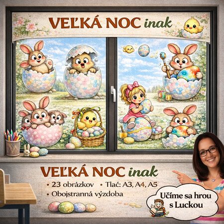 Súbor obsahuje 23 obojstranných obrázkov, ktoré krásne ozdobia okno v triede a navodia pravú veľkonočnú atmosféru. Nájdete tu veselé deti aj veľkonočné motívy – napríklad zajačikov, kuriatka, baránkov, kraslice, korbáče alebo jarné kvety. Obrázky zachytávajú radosť, tradície a hravosť Veľkej noci.