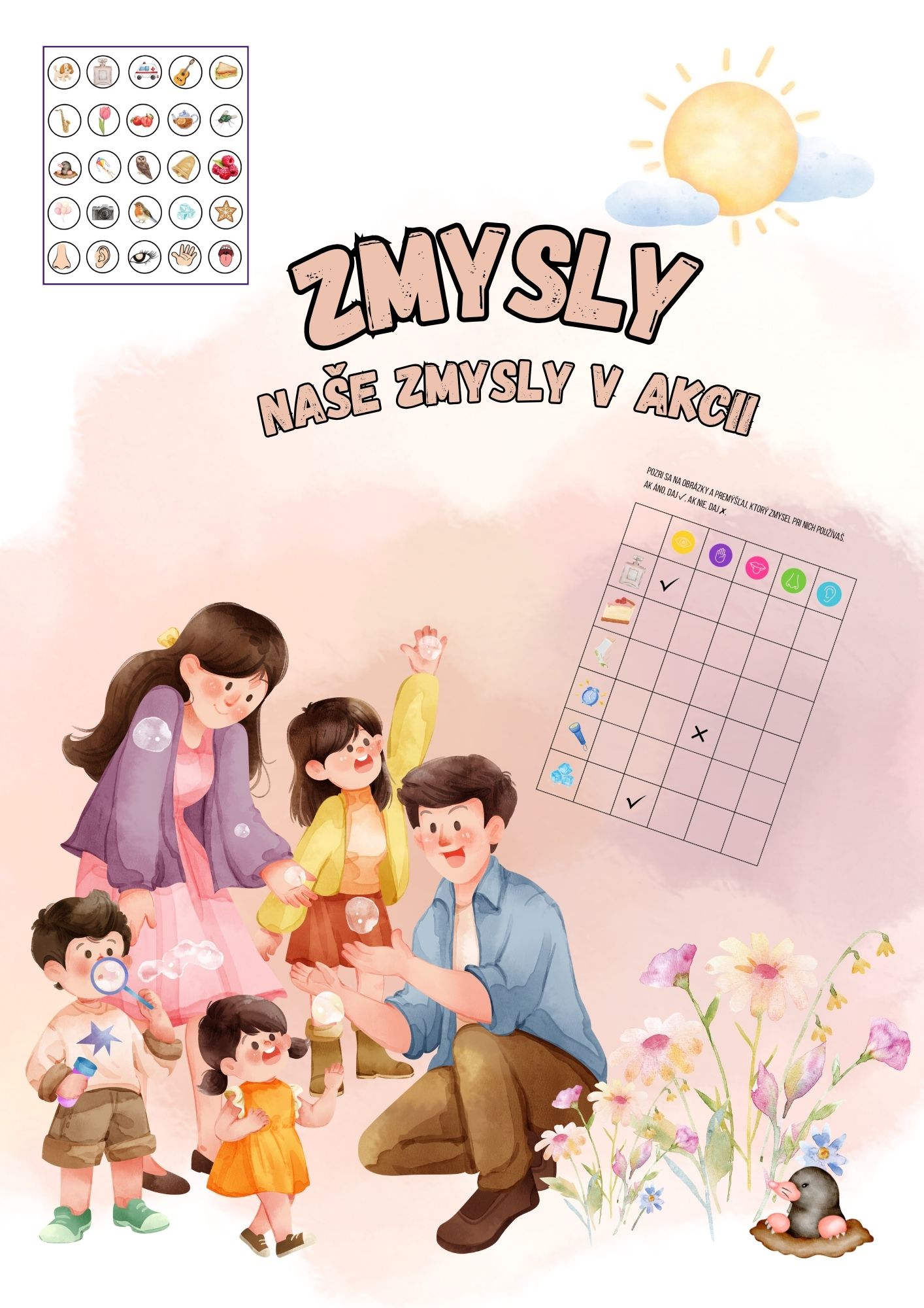 Materiál obsahuje 20 obrázkov predmetov, 5 obrázkov zmyslov (čuch, chuť, hmat, sluch, zrak) a 1 pracovný list na fixáciu učiva.