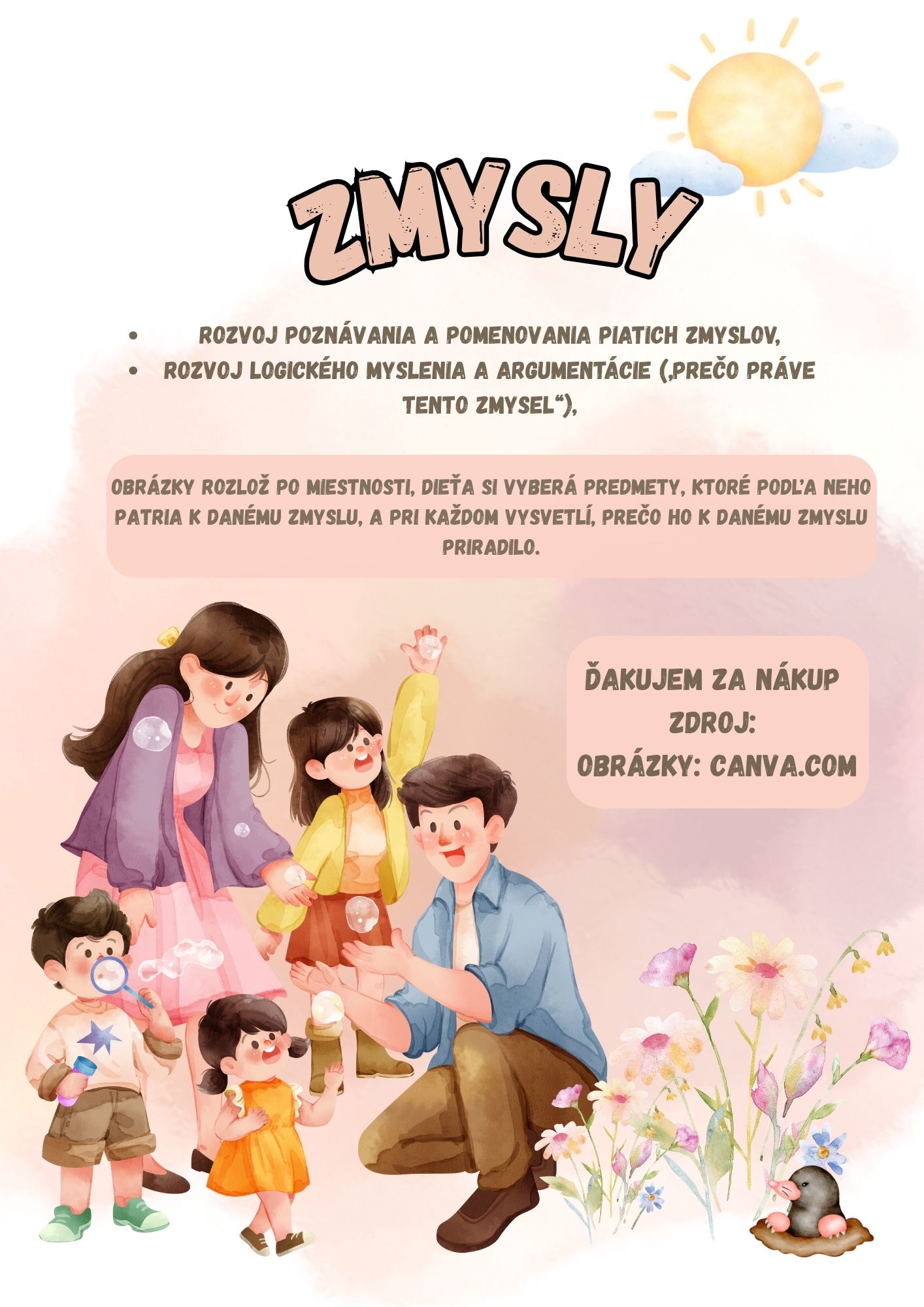 Tento materiál je určený na hravé precvičovanie a upevňovanie poznatkov o piatich ľudských zmysloch – zrak, sluch, čuch, hmat a chuť.